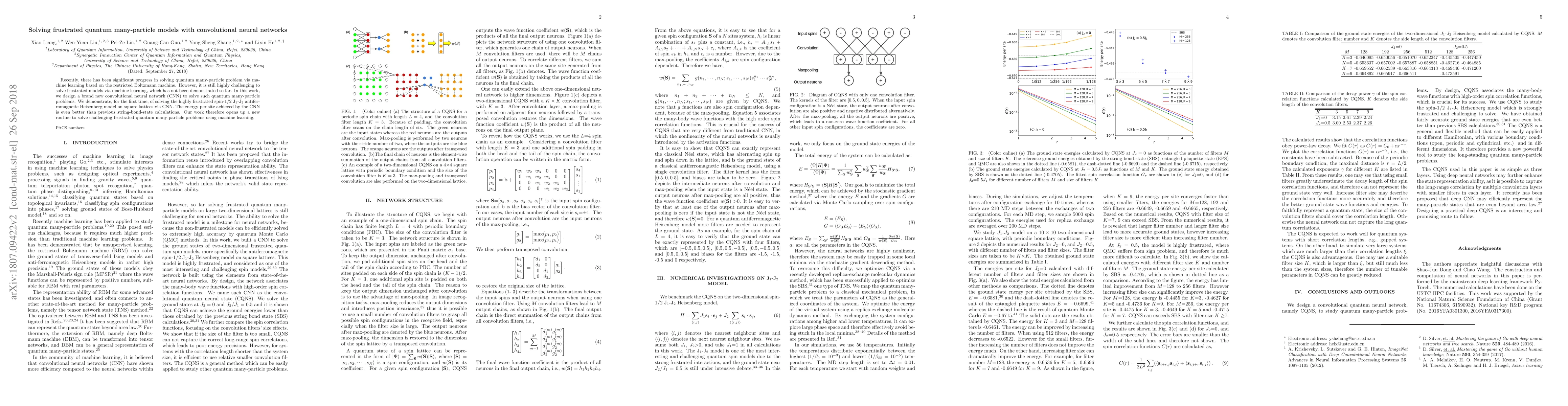 This paper introduces a convolutional neural network (CNN) to solve highly frustrated quantum many-particle models, specifically the spin-1/2 J$_1$-J$_2$ antiferromagnetic Heisenberg model. The CNN achieves better energy per site than previous string-bond-state calculations, demonstrating a new approach for tackling complex quantum problems.