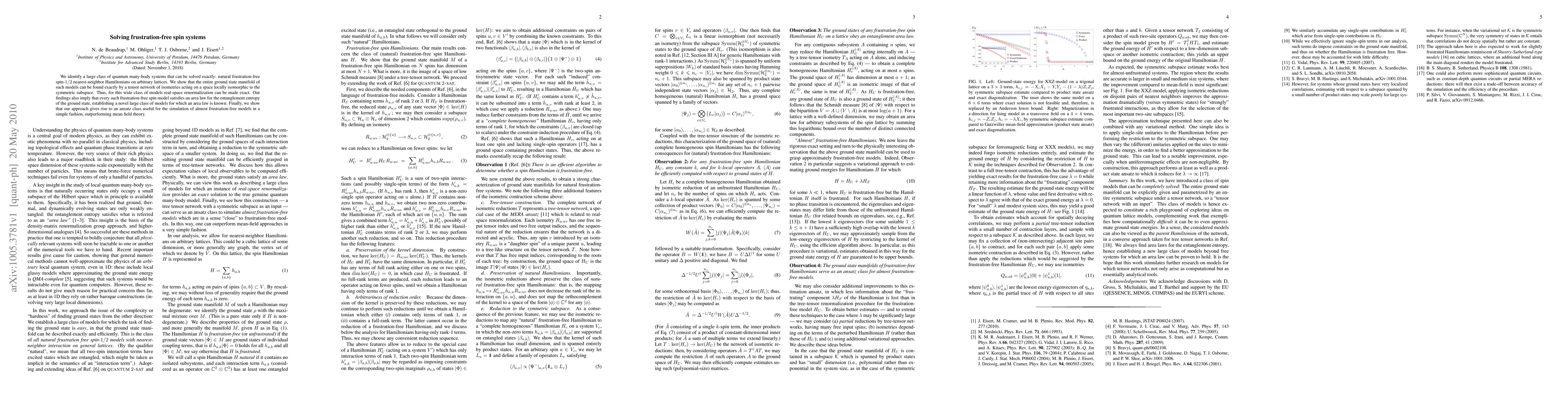 We identify a large class of quantum many-body systems that can be solved exactly: natural frustration-free spin-1/2 nearest-neighbor Hamiltonians on arbitrary lattices. We show that the entire ground state manifold of such models can be found exactly by a tensor network of isometries acting on a space locally isomorphic to the symmetric subspace. Thus, for this wide class of models real-space renormalization can be made exact. Our findings also imply that every such frustration-free spin model satisfies an area law for the entanglement entropy of the ground state, establishing a novel large class of models for which an area law is known. Finally, we show that our approach gives rise to an ansatz class useful for the simulation of almost frustration-free models in a simple fashion, outperforming mean field theory.