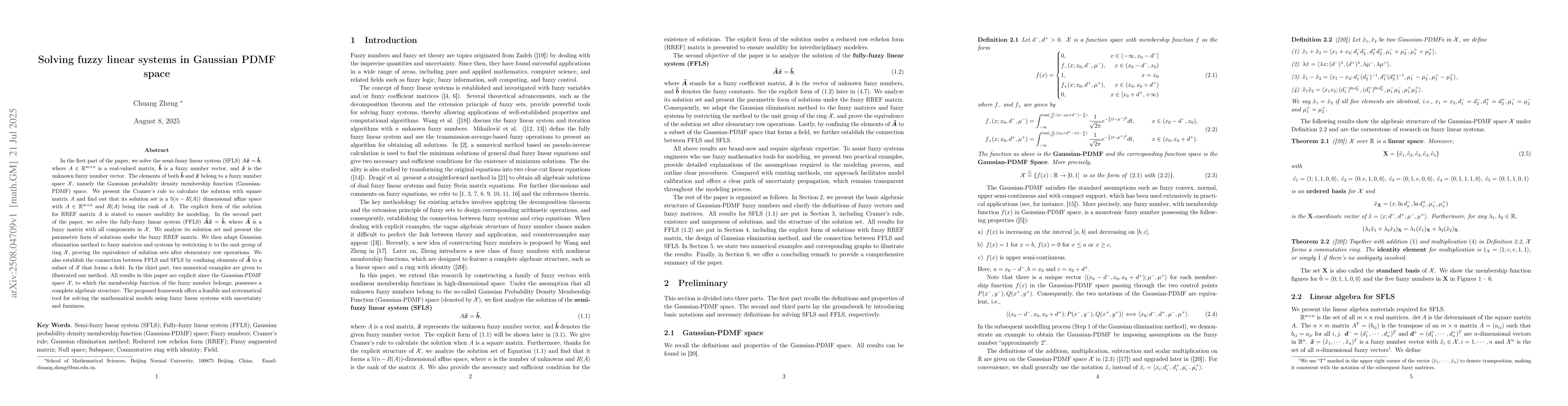 In the first part of the paper, we solve the semi-fuzzy linear system (SFLS) $A \mathbf{\tilde{x}}= \mathbf{\tilde{b}}$, where $A\in \mathbb{R}^{m\times n}$ is a real-valued matrix, $\mathbf{\tilde{b}}$ is a fuzzy number vector, and $\mathbf{\tilde{x}}$ is the unknown fuzzy number vector. The elements of both $\mathbf{\tilde{b}}$ and $\mathbf{\tilde{x}}$ belong to a fuzzy number space $\mathcal{X}$, namely the Gaussian probability density membership function (Gaussian-PDMF) space. We present the Cramer's rule to calculate the solution with square matrix $A$ and find out that its solution set is a $5(n-R(A))$ dimensional affine space with $A\in \mathbb{R}^{m\times n}$ and $R(A)$ being the rank of $A$. The explicit form of the solution for RREF matrix $A$ is stated to ensure usability for modeling. In the second part of the paper, we solve the fully-fuzzy linear system (FFLS) $\mathbf{\tilde{A}}\mathbf{\tilde{x}}=\mathbf{\tilde{b}}$, where $\mathbf{\tilde{A}}$ is a fuzzy matrix with all components in $\mathcal{X}$. We analyze its solution set and present the parametric form of solutions under the fuzzy RREF matrix. We then adapt Gaussian elimination method to fuzzy matrices and systems by restricting it to the unit group of ring $\mathcal{X}$, proving the equivalence of solution sets after elementary row operations. We also establish the connection between FFLS and SFLS by confining elements of $\mathbf{\tilde{A}}$ to a subset of $\mathcal{X}$ that forms a field. In the third part, two numerical examples are given to illustrated our method. All results in this paper are explicit since the Gaussian-PDMF space $\mathcal{X}$, to which the membership function of the fuzzy number belongs, possesses a complete algebraic structure. The proposed framework offers a feasible and systematical tool for solving the mathematical models using fuzzy linear systems with uncertainty and fuzziness.