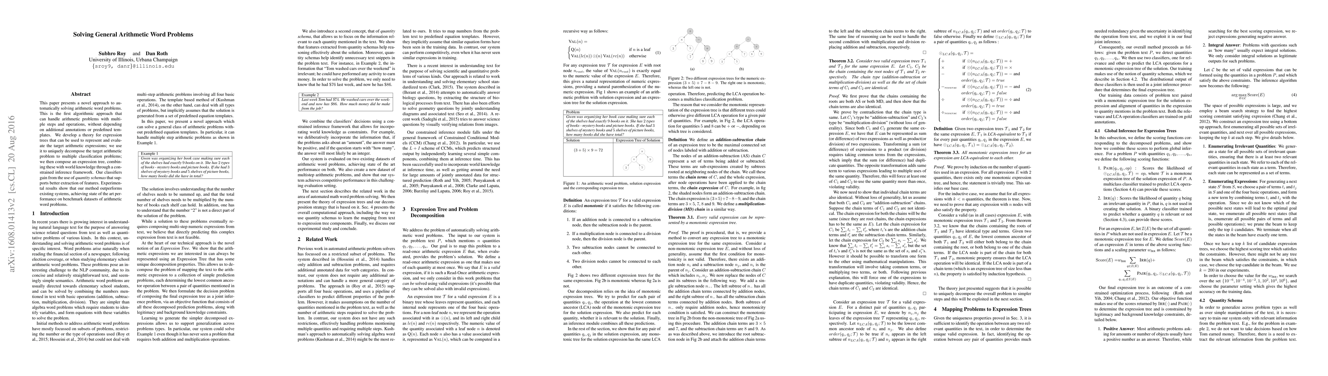 This paper introduces an innovative algorithmic approach for solving complex arithmetic word problems with multiple steps, using expression trees to represent and evaluate problems, and leveraging quantity schemas for feature extraction, achieving superior performance compared to existing systems.