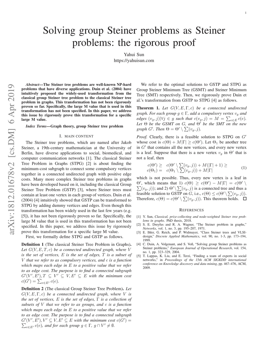 This paper rigorously proves the transformation from the group Steiner tree problem to the classical Steiner tree problem, addressing the unspecified large M value used in the proposed method by Duin et al. (2004).