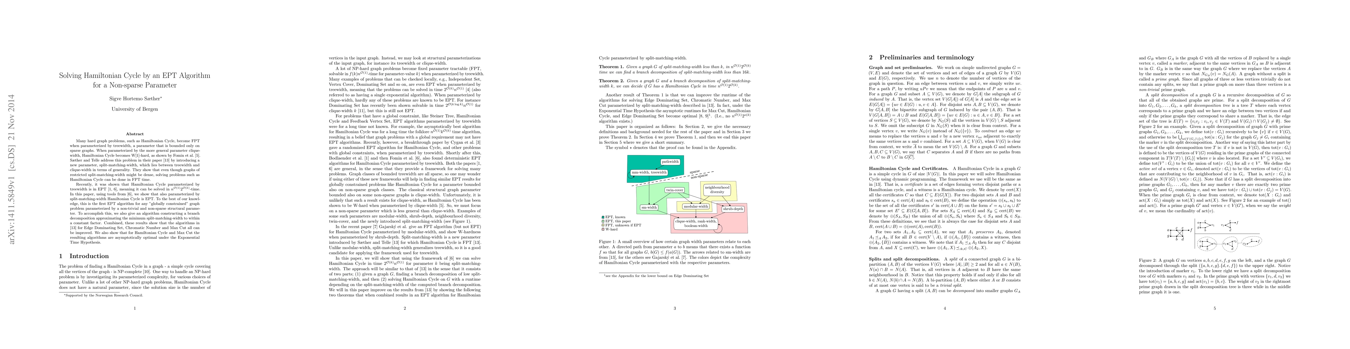 This paper presents an EPT algorithm for solving the Hamiltonian Cycle problem when parameterized by split-matching-width, a non-sparse structural parameter. It constructs a branch decomposition approximating the minimum split-matching-width, demonstrating the first EPT algorithm for a globally constrained graph problem with such a parameter.