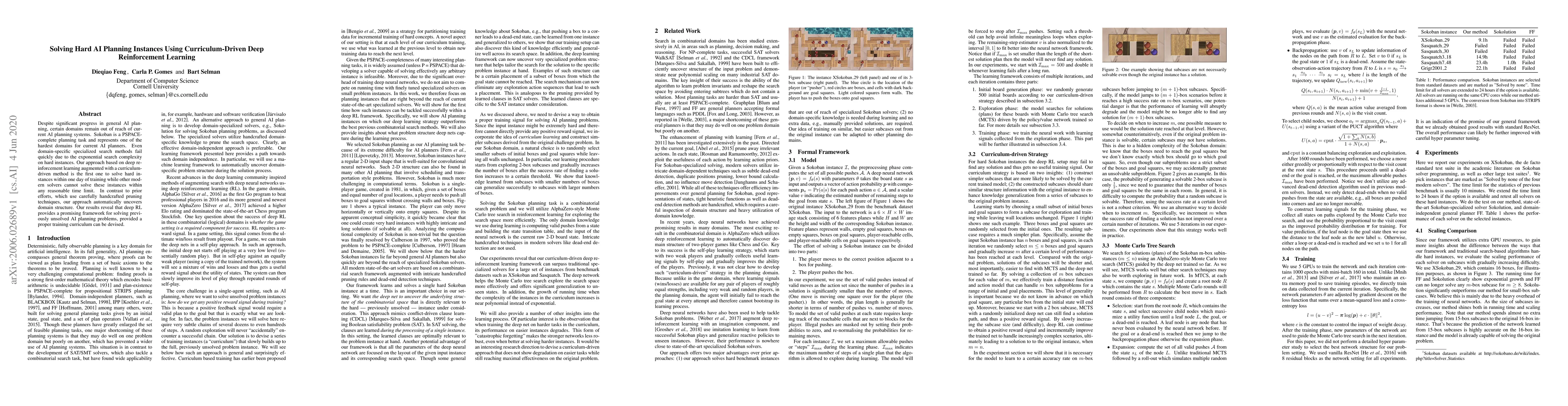 This paper introduces a deep reinforcement learning approach enhanced with curriculum learning to solve hard AI planning instances, specifically tackling the PSPACE-complete Sokoban problem. Unlike traditional methods, this novel technique autonomously discovers domain structure, successfully solving instances within a day, outperforming other modern solvers.