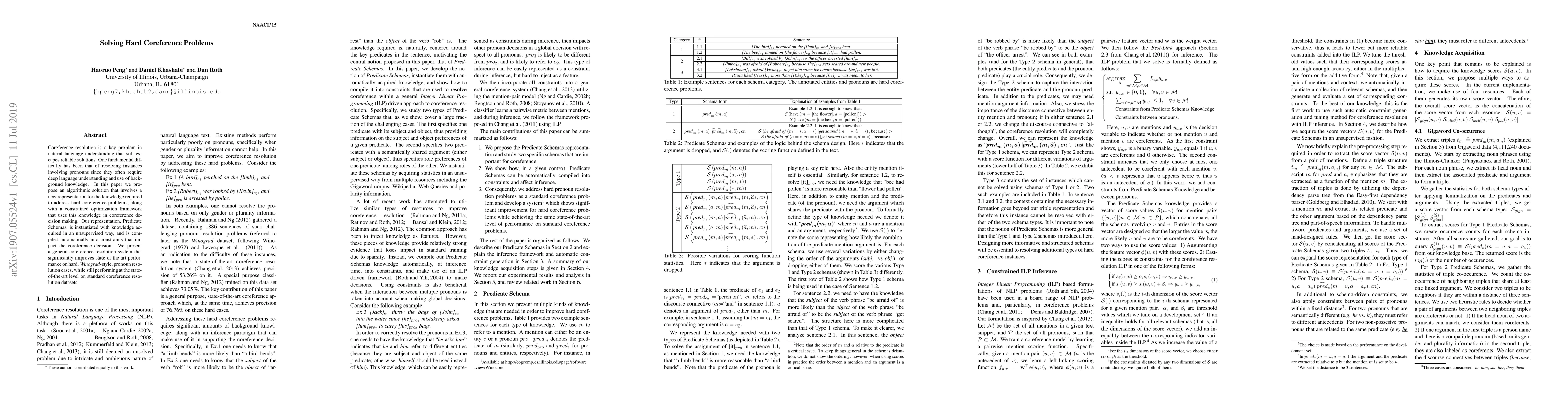 Coreference resolution is a key problem in natural language understanding that still escapes reliable solutions. One fundamental difficulty has been that of resolving instances involving pronouns since they often require deep language understanding and use of background knowledge. In this paper, we propose an algorithmic solution that involves a new representation for the knowledge required to address hard coreference problems, along with a constrained optimization framework that uses this knowledge in coreference decision making. Our representation, Predicate Schemas, is instantiated with knowledge acquired in an unsupervised way, and is compiled automatically into constraints that impact the coreference decision. We present a general coreference resolution system that significantly improves state-of-the-art performance on hard, Winograd-style, pronoun resolution cases, while still performing at the state-of-the-art level on standard coreference resolution datasets.