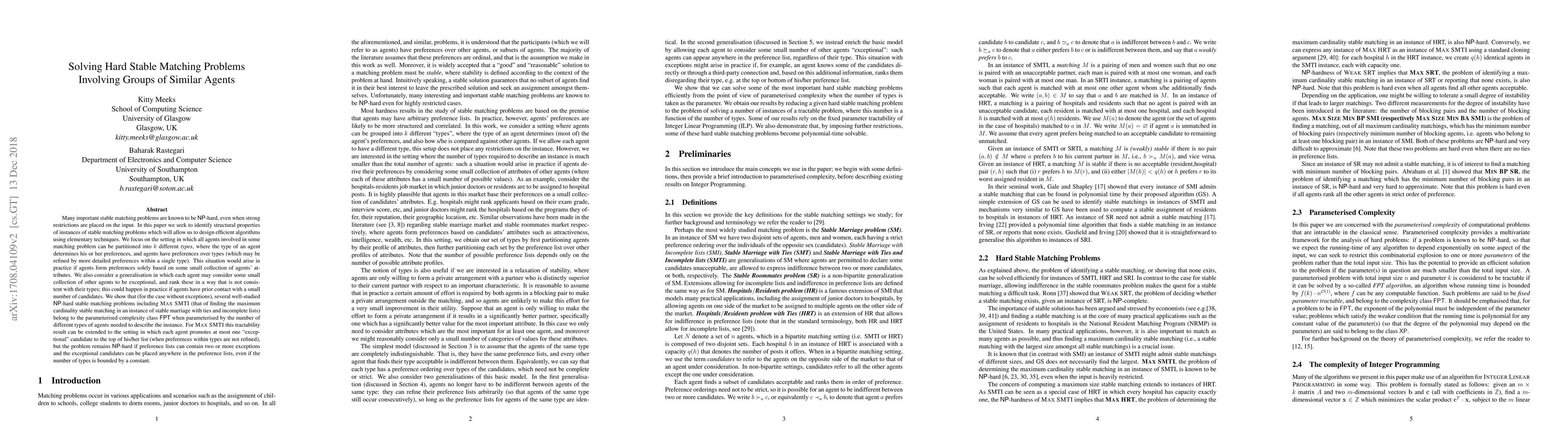 This paper explores efficient algorithms for solving NP-hard stable matching problems by partitioning agents into types based on shared attributes, demonstrating that several such problems become tractable when parameterized by the number of agent types. It also examines the impact of exceptional candidates on problem complexity, showing that while one exception can be managed, two or more exceptions lead to NP-hardness.