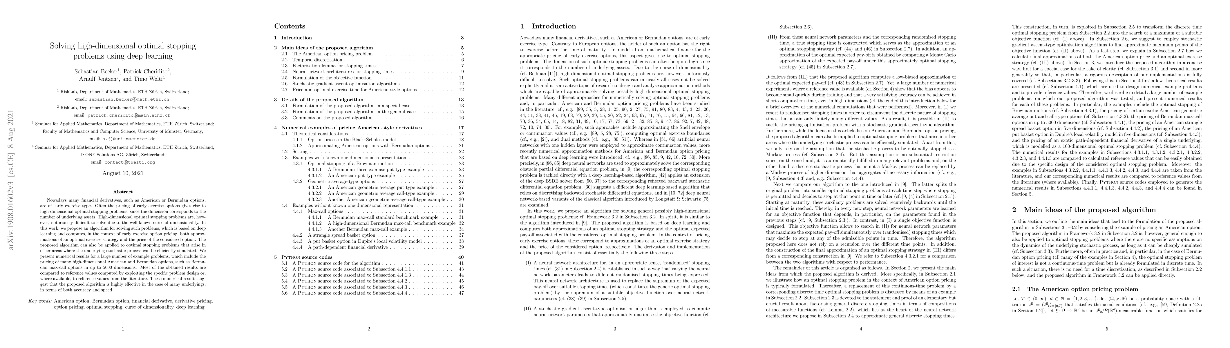 This paper proposes a deep learning-based algorithm to solve high-dimensional optimal stopping problems, particularly for early exercise options like American and Bermudan options. The algorithm efficiently computes optimal exercise strategies and option prices, demonstrating effectiveness through numerical results on high-dimensional examples, including Bermudan max-call options in up to 5000 dimensions.