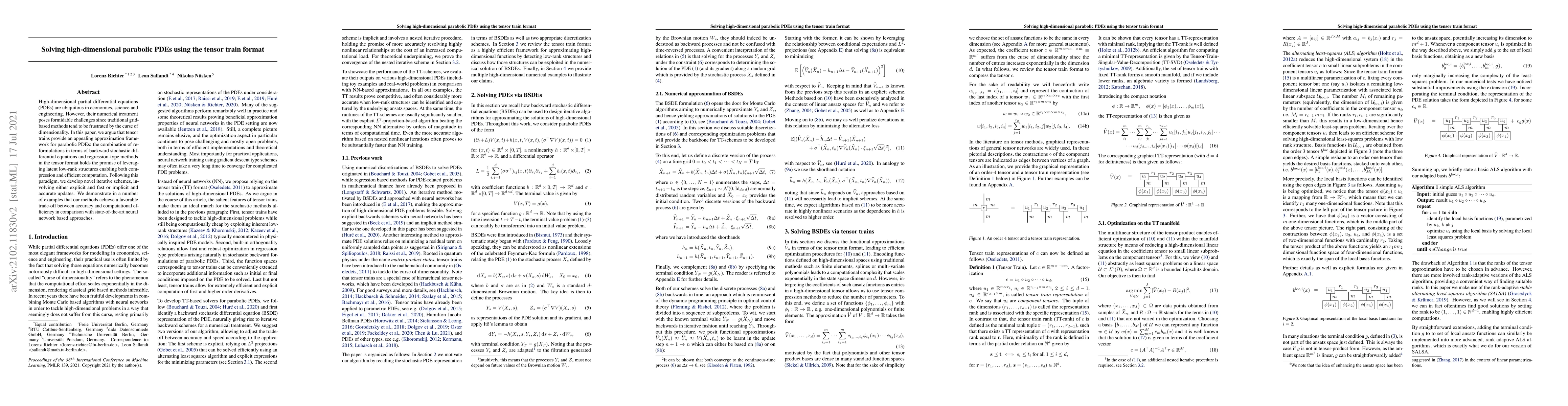 This paper proposes using tensor train formats to efficiently solve high-dimensional parabolic PDEs, leveraging low-rank structures for both compression and computation. The developed iterative schemes offer a balance between accuracy and efficiency, outperforming neural network-based approaches in various examples.