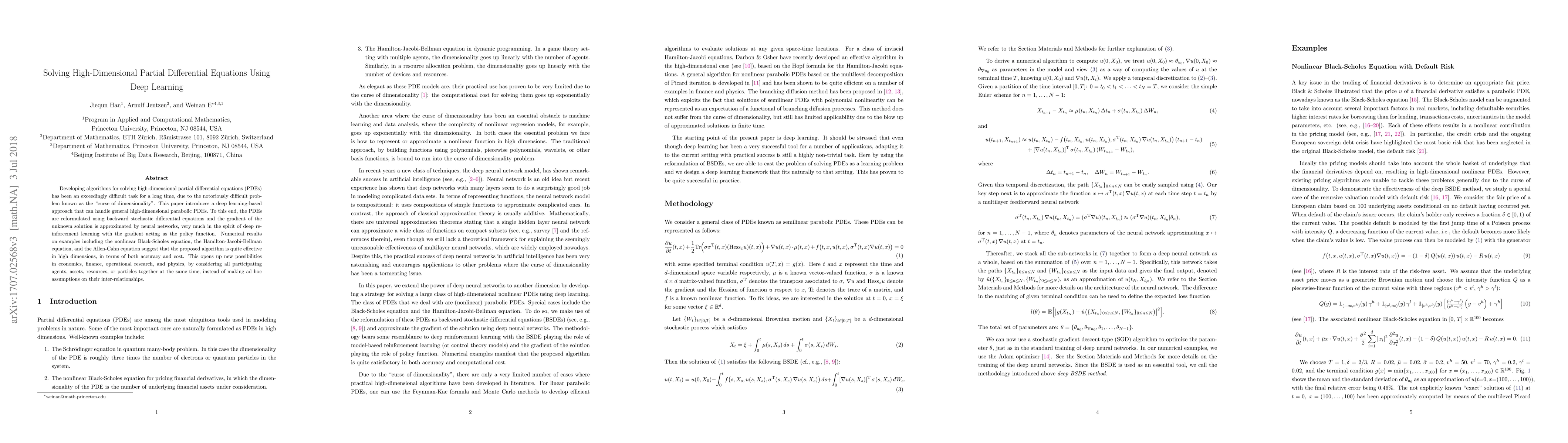 This paper proposes a deep learning-based method to solve high-dimensional partial differential equations (PDEs) by reformulating them using backward stochastic differential equations and approximating gradients with neural networks. The approach demonstrates effectiveness in solving complex PDEs, offering new possibilities in economics, finance, and physics.