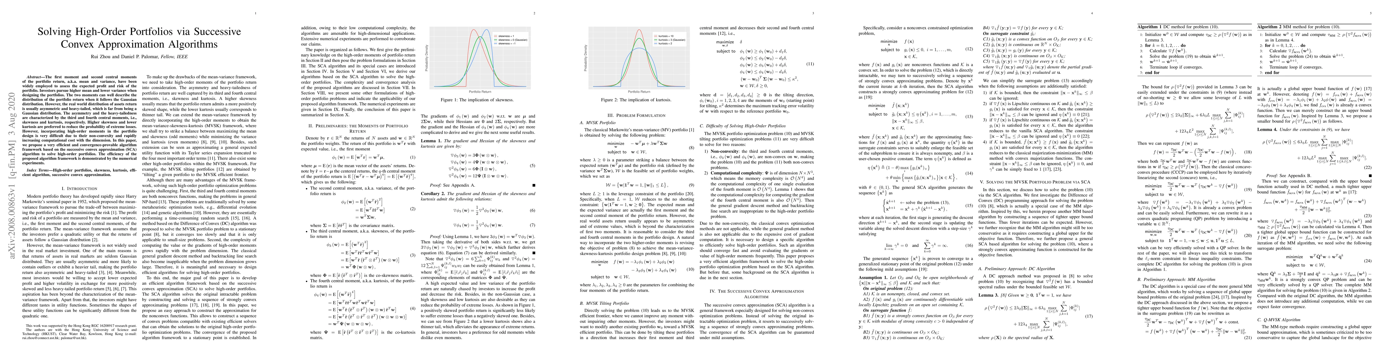 The first moment and second central moments of the portfolio return, a.k.a. mean and variance, have been widely employed to assess the expected profit and risk of the portfolio. Investors pursue higher mean and lower variance when designing the portfolios. The two moments can well describe the distribution of the portfolio return when it follows the Gaussian distribution. However, the real world distribution of assets return is usually asymmetric and heavy-tailed, which is far from being a Gaussian distribution. The asymmetry and the heavy-tailedness are characterized by the third and fourth central moments, i.e., skewness and kurtosis, respectively. Higher skewness and lower kurtosis are preferred to reduce the probability of extreme losses. However, incorporating high-order moments in the portfolio design is very difficult due to their non-convexity and rapidly increasing computational cost with the dimension. In this paper, we propose a very efficient and convergence-provable algorithm framework based on the successive convex approximation (SCA) algorithm to solve high-order portfolios. The efficiency of the proposed algorithm framework is demonstrated by the numerical experiments.