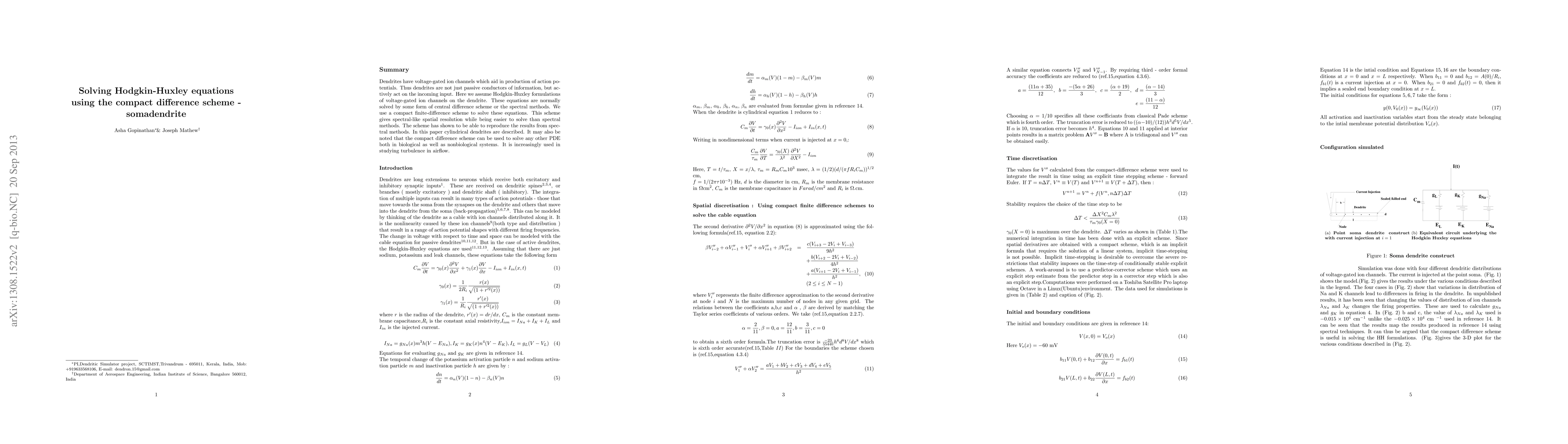 This paper uses a compact finite-difference scheme to solve Hodgkin-Huxley equations for voltage-gated ion channels in dendrites, reproducing results from spectral methods with improved ease of solution.