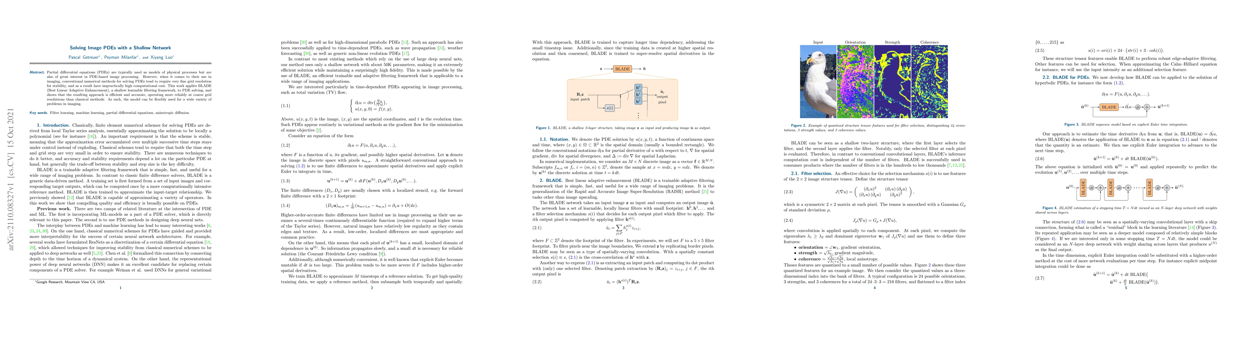 Partial differential equations (PDEs) are typically used as models of physical processes but are also of great interest in PDE-based image processing. However, when it comes to their use in imaging, conventional numerical methods for solving PDEs tend to require very fine grid resolution for stability, and as a result have impractically high computational cost. This work applies BLADE (Best Linear Adaptive Enhancement), a shallow learnable filtering framework, to PDE solving, and shows that the resulting approach is efficient and accurate, operating more reliably at coarse grid resolutions than classical methods. As such, the model can be flexibly used for a wide variety of problems in imaging.