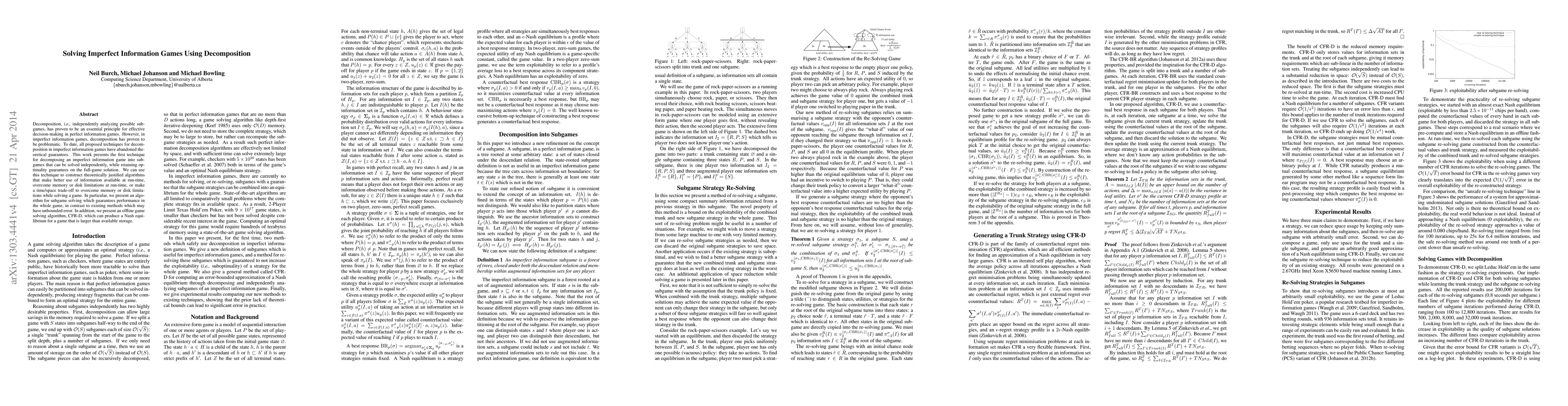 This paper introduces a novel technique for decomposing imperfect information games into subgames that can be solved independently while maintaining optimality guarantees for the full game. The proposed method enables the development of algorithms that optimize runtime information usage, manage memory constraints, and achieve a time/space trade-off.