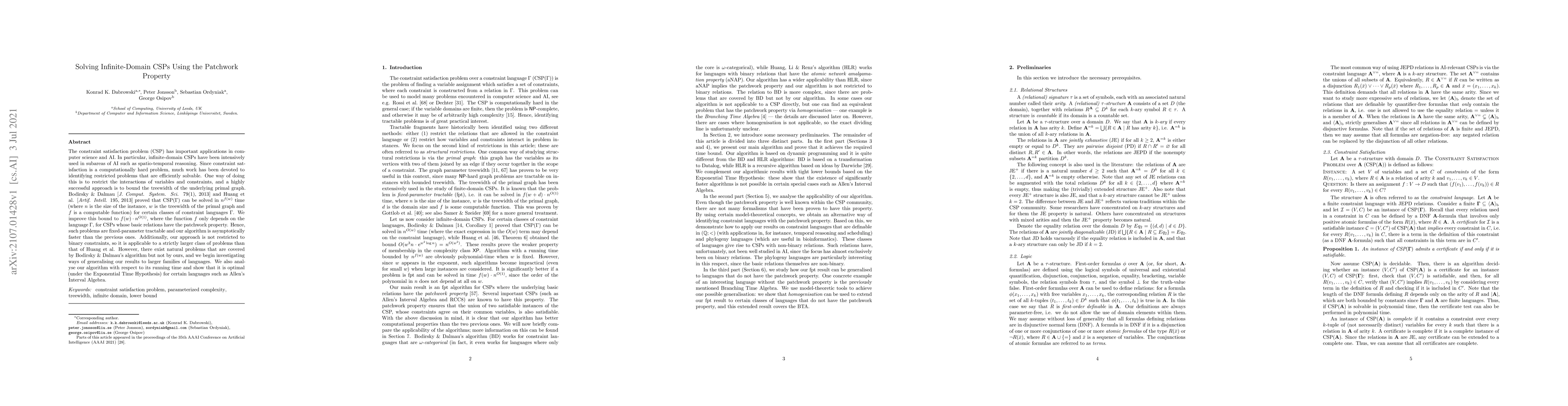 The constraint satisfaction problem (CSP) has important applications in computer science and AI. In particular, infinite-domain CSPs have been intensively used in subareas of AI such as spatio-temporal reasoning. Since constraint satisfaction is a computationally hard problem, much work has been devoted to identifying restricted problems that are efficiently solvable. One way of doing this is to restrict the interactions of variables and constraints, and a highly successful approach is to bound the treewidth of the underlying primal graph. Bodirsky & Dalmau [J. Comput. System. Sci. 79(1), 2013] and Huang et al. [Artif. Intell. 195, 2013] proved that CSP$(\Gamma)$ can be solved in $n^{f(w)}$ time (where $n$ is the size of the instance, $w$ is the treewidth of the primal graph and $f$ is a computable function) for certain classes of constraint languages $\Gamma$. We improve this bound to $f(w) \cdot n^{O(1)}$, where the function $f$ only depends on the language $\Gamma$, for CSPs whose basic relations have the patchwork property. Hence, such problems are fixed-parameter tractable and our algorithm is asymptotically faster than the previous ones. Additionally, our approach is not restricted to binary constraints, so it is applicable to a strictly larger class of problems than that of Huang et al. However, there exist natural problems that are covered by Bodirsky & Dalmau's algorithm but not by ours, and we begin investigating ways of generalising our results to larger families of languages. We also analyse our algorithm with respect to its running time and show that it is optimal (under the Exponential Time Hypothesis) for certain languages such as Allen's Interval Algebra.