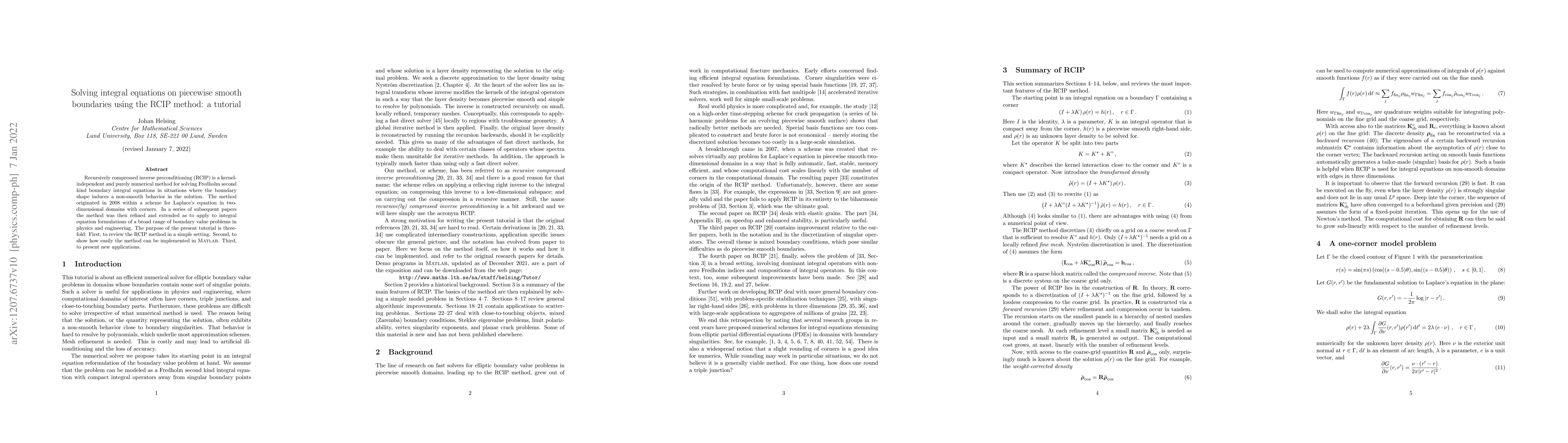 This paper reviews the Recursively Compressed Inverse Preconditioning (RCIP) method for solving Fredholm second kind boundary integral equations on piecewise smooth boundaries. It demonstrates the method's implementation in Matlab and presents new applications to a variety of physical and engineering problems.