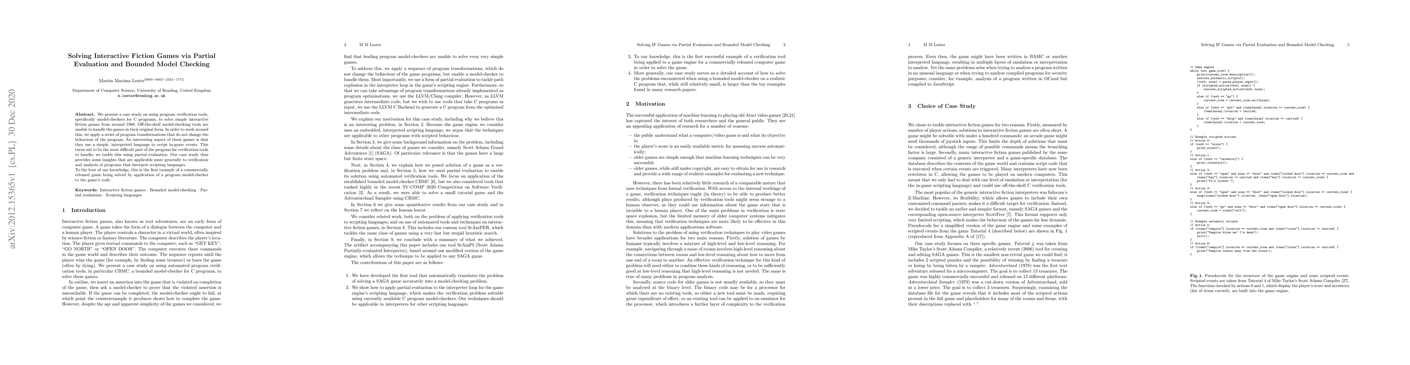 Researchers used program verification tools to solve simple interactive fiction games from 1980 by applying transformations and partial evaluation, providing insights into verifying programs that interpret scripting languages.