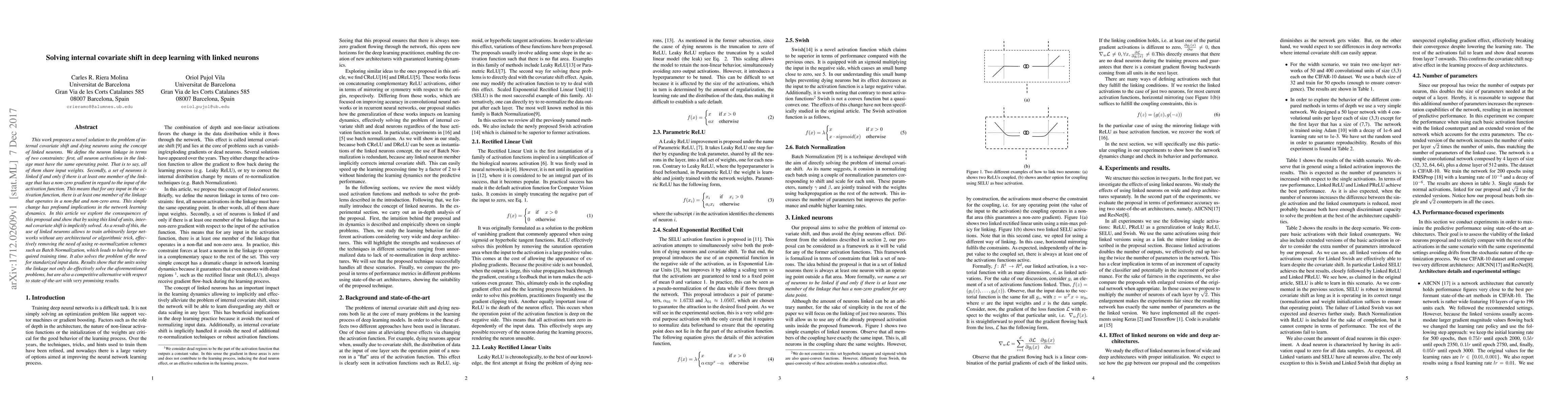This work proposes a novel solution to the problem of internal covariate shift and dying neurons using the concept of linked neurons. We define the neuron linkage in terms of two constraints: first, all neuron activations in the linkage must have the same operating point. That is to say, all of them share input weights. Secondly, a set of neurons is linked if and only if there is at least one member of the linkage that has a non-zero gradient in regard to the input of the activation function. This means that for any input in the activation function, there is at least one member of the linkage that operates in a non-flat and non-zero area. This simple change has profound implications in the network learning dynamics. In this article we explore the consequences of this proposal and show that by using this kind of units, internal covariate shift is implicitly solved. As a result of this, the use of linked neurons allows to train arbitrarily large networks without any architectural or algorithmic trick, effectively removing the need of using re-normalization schemes such as Batch Normalization, which leads to halving the required training time. It also solves the problem of the need for standarized input data. Results show that the units using the linkage not only do effectively solve the aforementioned problems, but are also a competitive alternative with respect to state-of-the-art with very promising results.