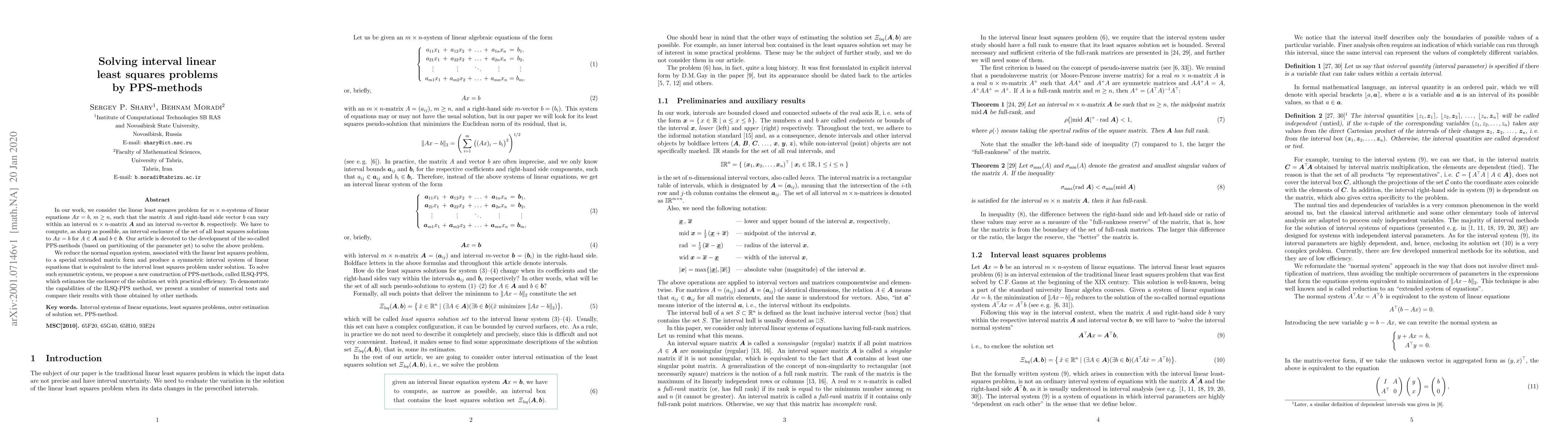 The paper presents a method called ILSQ-PPS for outer estimation of least squares solution sets of interval linear systems with a full-rank matrix, developed from Partitioning of Parameter Set (PPS) methods.
