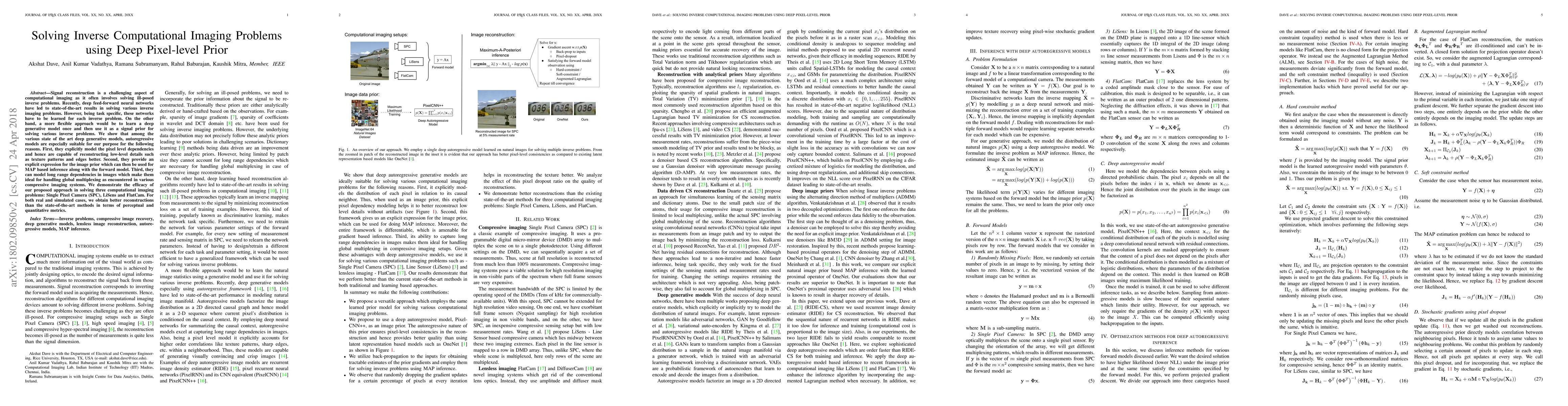 This paper proposes using autoregressive deep generative models as pixel-level priors to solve inverse computational imaging problems, demonstrating superior reconstruction quality over state-of-the-art methods in tasks like Single Pixel Camera, LiSens, and FlatCam. The models excel at capturing pixel-level dependencies and long-range image features, enabling effective MAP-based inference.