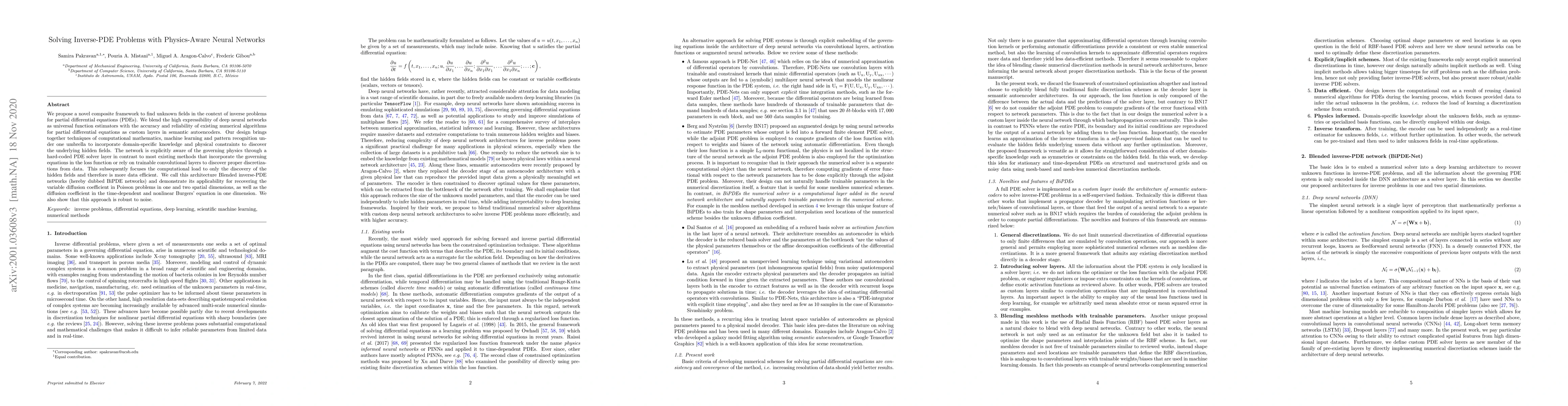 Researchers developed a new neural network framework called Blended inverse-PDE networks to solve complex mathematical problems related to partial differential equations. This approach focuses the computational load on discovering hidden fields while incorporating domain-specific knowledge for more efficient data use.