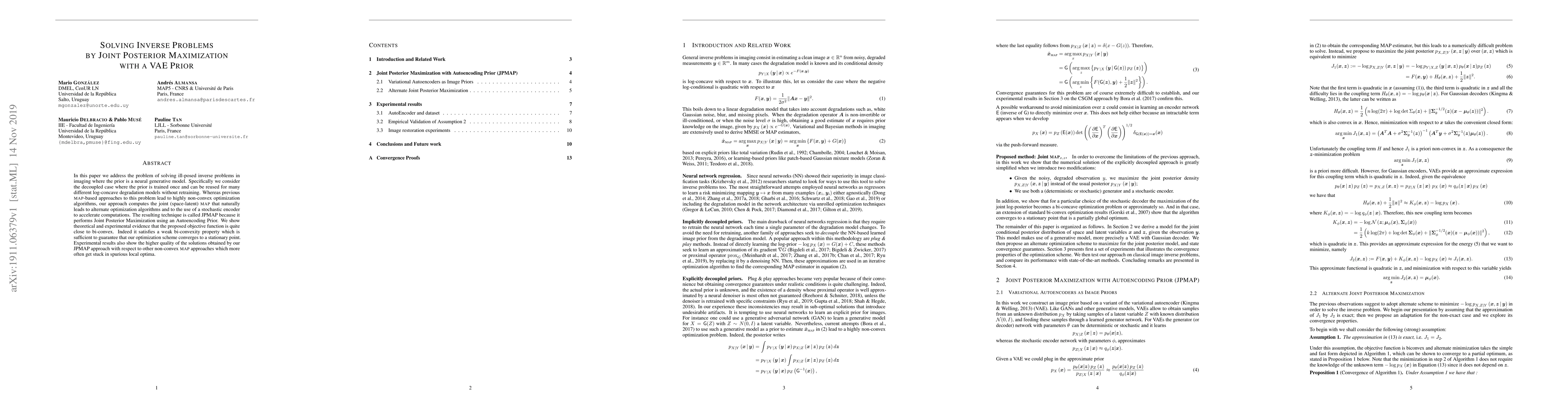 In this paper we address the problem of solving ill-posed inverse problems in imaging where the prior is a neural generative model. Specifically we consider the decoupled case where the prior is trained once and can be reused for many different log-concave degradation models without retraining. Whereas previous MAP-based approaches to this problem lead to highly non-convex optimization algorithms, our approach computes the joint (space-latent) MAP that naturally leads to alternate optimization algorithms and to the use of a stochastic encoder to accelerate computations. The resulting technique is called JPMAP because it performs Joint Posterior Maximization using an Autoencoding Prior. We show theoretical and experimental evidence that the proposed objective function is quite close to bi-convex. Indeed it satisfies a weak bi-convexity property which is sufficient to guarantee that our optimization scheme converges to a stationary point. Experimental results also show the higher quality of the solutions obtained by our JPMAP approach with respect to other non-convex MAP approaches which more often get stuck in spurious local optima.