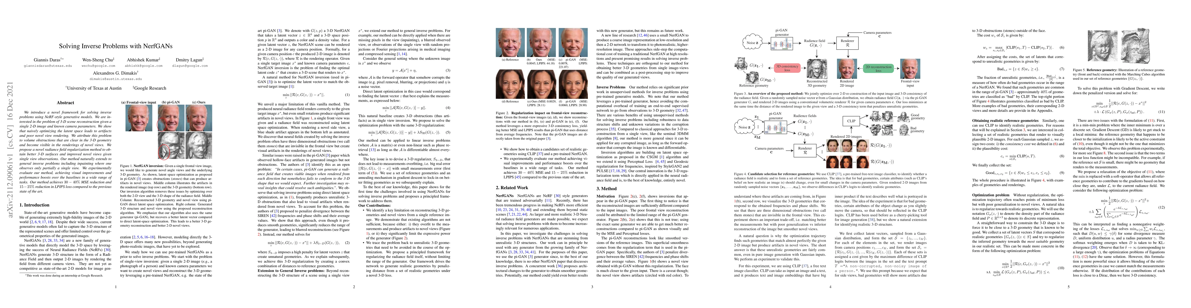 We introduce a novel framework for solving inverse problems using NeRF-style generative models. We are interested in the problem of 3-D scene reconstruction given a single 2-D image and known camera parameters. We show that naively optimizing the latent space leads to artifacts and poor novel view rendering. We attribute this problem to volume obstructions that are clear in the 3-D geometry and become visible in the renderings of novel views. We propose a novel radiance field regularization method to obtain better 3-D surfaces and improved novel views given single view observations. Our method naturally extends to general inverse problems including inpainting where one observes only partially a single view. We experimentally evaluate our method, achieving visual improvements and performance boosts over the baselines in a wide range of tasks. Our method achieves $30-40\%$ MSE reduction and $15-25\%$ reduction in LPIPS loss compared to the previous state of the art.