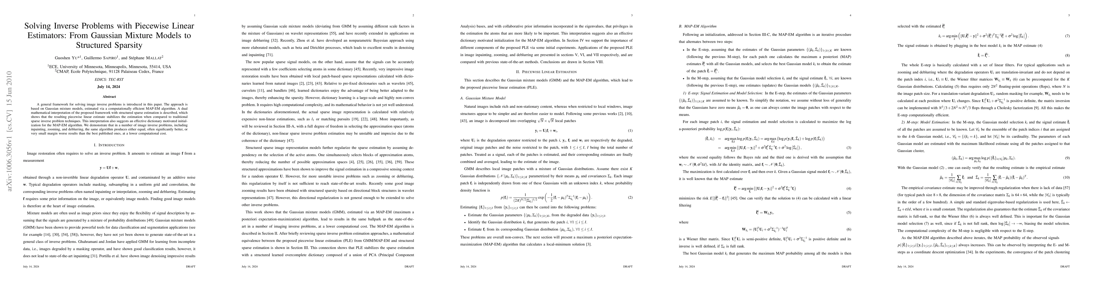 This paper introduces a framework for solving image inverse problems using Gaussian mixture models and a MAP-EM algorithm, which stabilizes estimation through structured sparse estimation and piecewise linear estimators. The proposed method achieves competitive results in tasks like inpainting, zooming, and deblurring at a lower computational cost.
