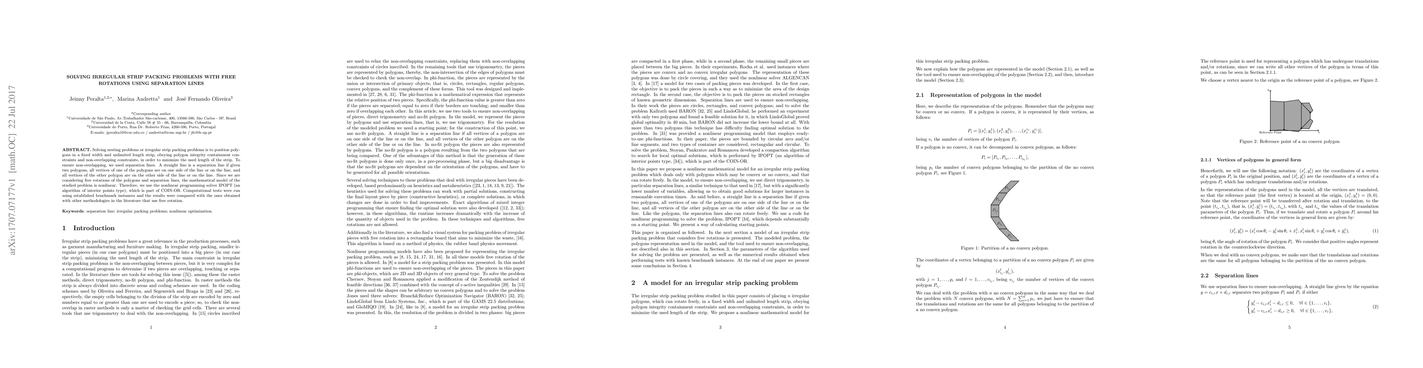 Solving nesting problems or irregular strip packing problems is to position polygons in a fixed width and unlimited length strip, obeying polygon integrity containment constraints and non-overlapping constraints, in order to minimize the used length of the strip. To ensure non-overlapping, we used separation lines. A straight line is a separation line if given two polygons, all vertices of one of the polygons are on one side of the line or on the line, and all vertices of the other polygon are on the other side of the line or on the line. Since we are considering free rotations of the polygons and separation lines, the mathematical model of the studied problem is nonlinear. Therefore, we use the nonlinear programming solver IPOPT (an algorithm of interior points type), which is part of COIN-OR. Computational tests were run using established benchmark instances and the results were compared with the ones obtained with other methodologies in the literature that use free rotation.