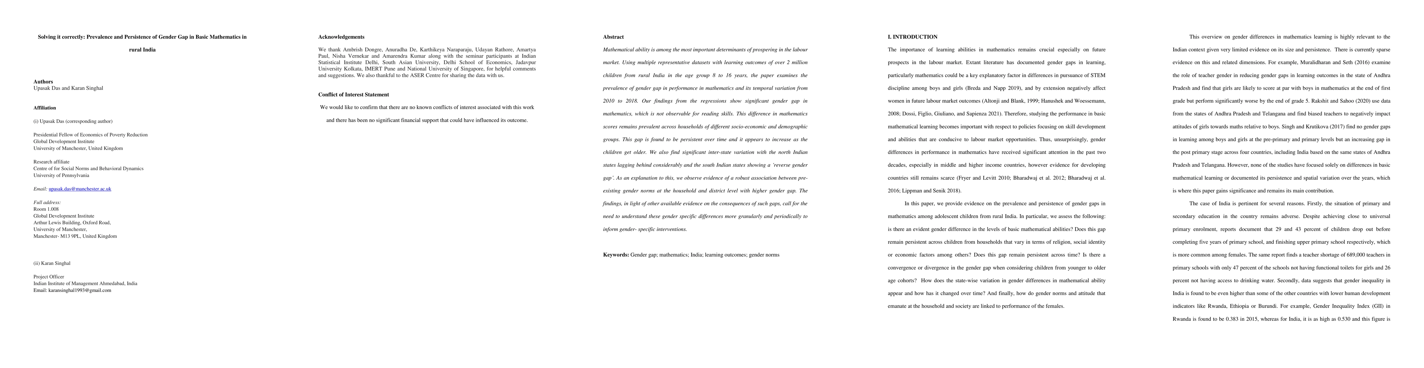 The paper reveals a persistent gender gap in mathematics performance among rural Indian children, which is more pronounced in older students and varies significantly across socio-economic groups and states. It highlights the need for targeted interventions to address these gender-specific educational disparities.