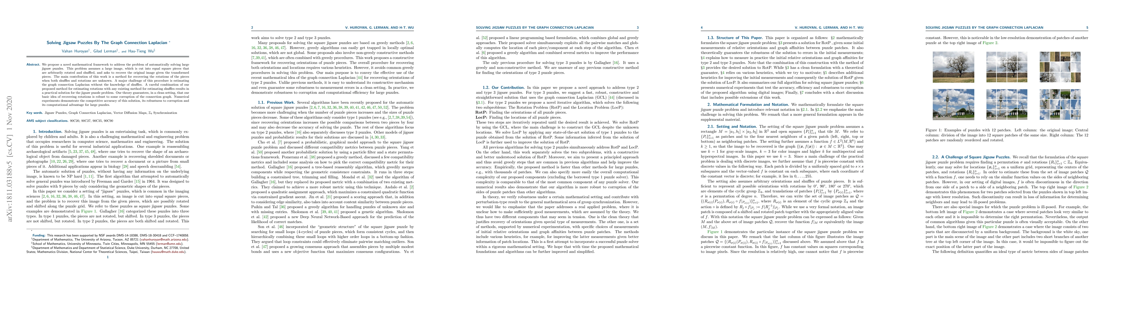 Researchers propose a method to solve jigsaw puzzles by analyzing the graph connection Laplacian, accurately recovering original images from transformed pieces with competitive accuracy.