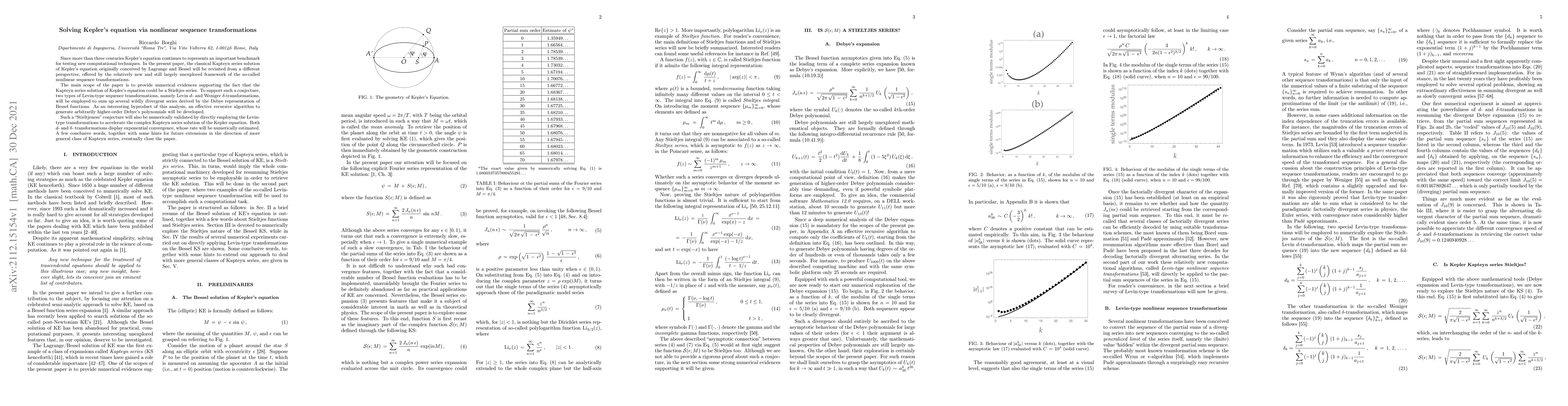 This paper explores solving Kepler's equation using nonlinear sequence transformations, specifically the Kapteyn series, and conjectures that it can be represented as a Stieltjes series. It employs Levin $d$- and Weniger $\delta$-transformations to accelerate the solution, demonstrating exponential convergence and developing a recursive algorithm for higher-order Debye polynomials.