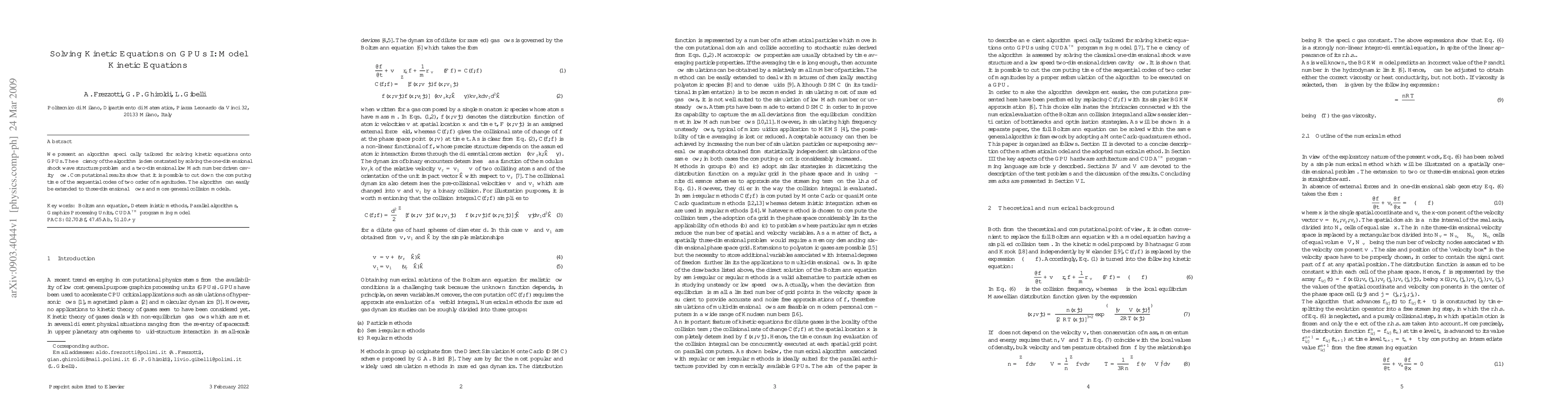 This paper introduces an optimized GPU algorithm for solving kinetic equations, significantly reducing computation time by two orders of magnitude compared to sequential methods. The algorithm is demonstrated through one-dimensional shock wave and two-dimensional low Mach number flow simulations, with potential for extension to three-dimensional applications.