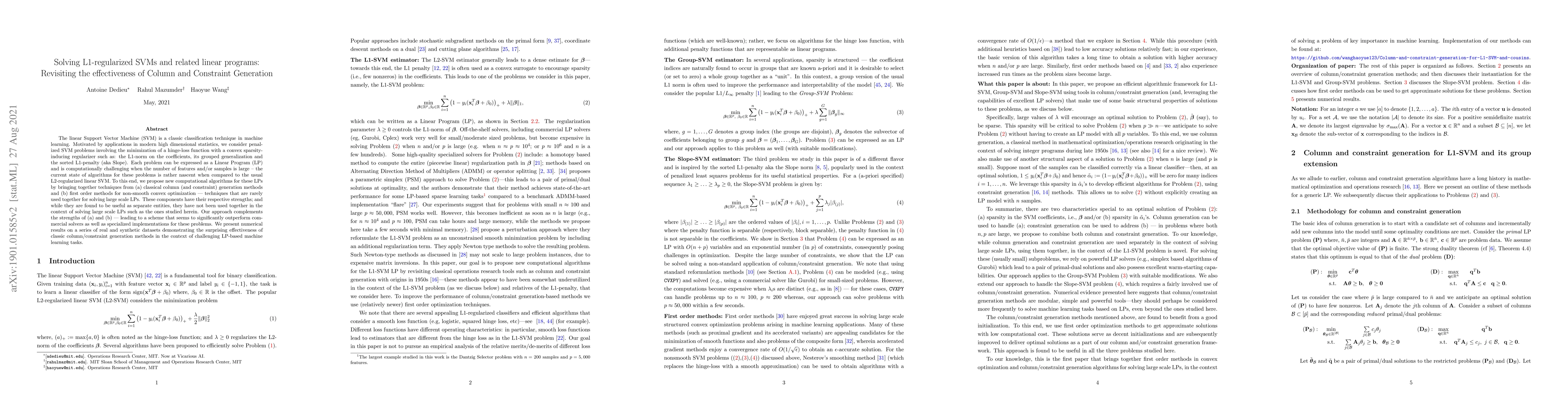 This paper proposes new computational algorithms for solving L1-regularized SVMs and related linear programs, combining classical column and constraint generation methods with first-order optimization techniques. The approach demonstrates significant performance improvements over commercial solvers and specialized implementations on both real and synthetic datasets.