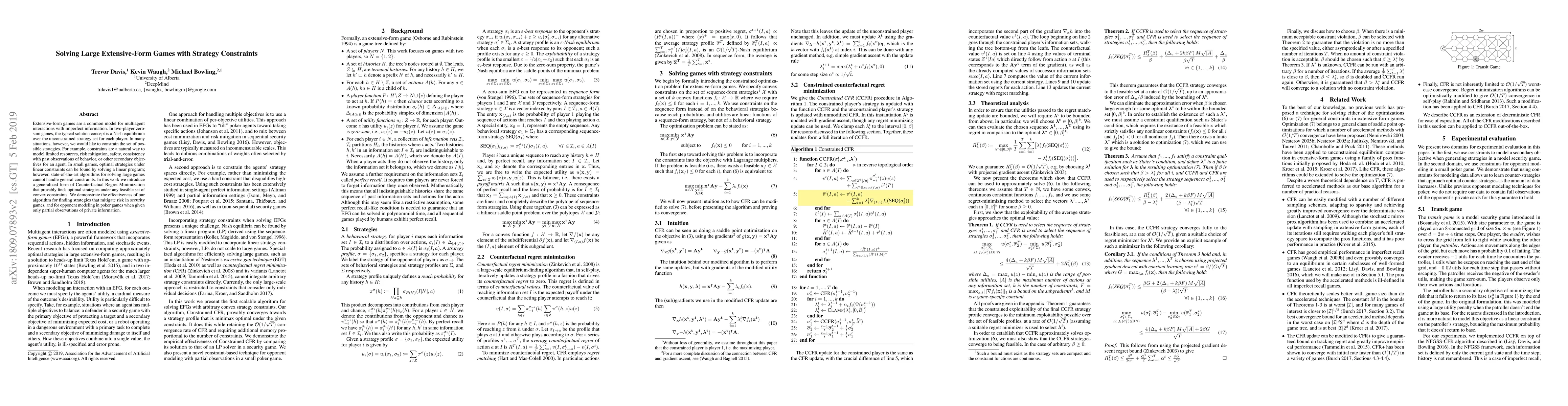 This paper proposes a generalized version of Counterfactual Regret Minimization to solve large extensive-form games under convex strategy constraints, demonstrating its effectiveness in risk mitigation and opponent modeling scenarios. The method can handle constraints that model limited resources and secondary objectives.