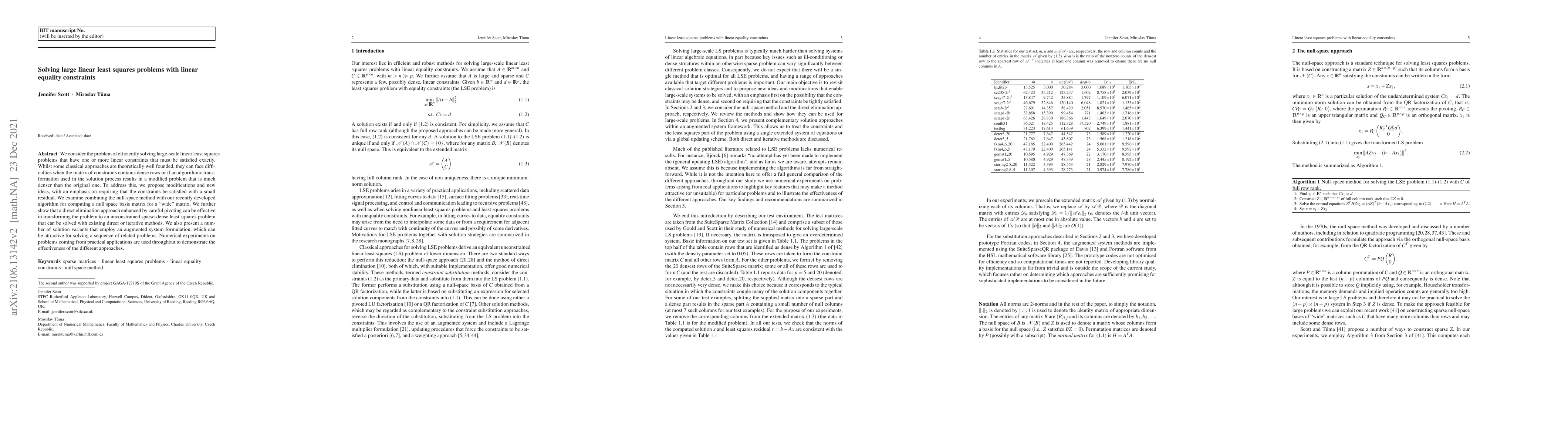 The paper presents novel modifications to classical methods and new ideas for solving large linear least squares problems with linear equality constraints, focusing on minimizing the constraint residual while maintaining computational efficiency.