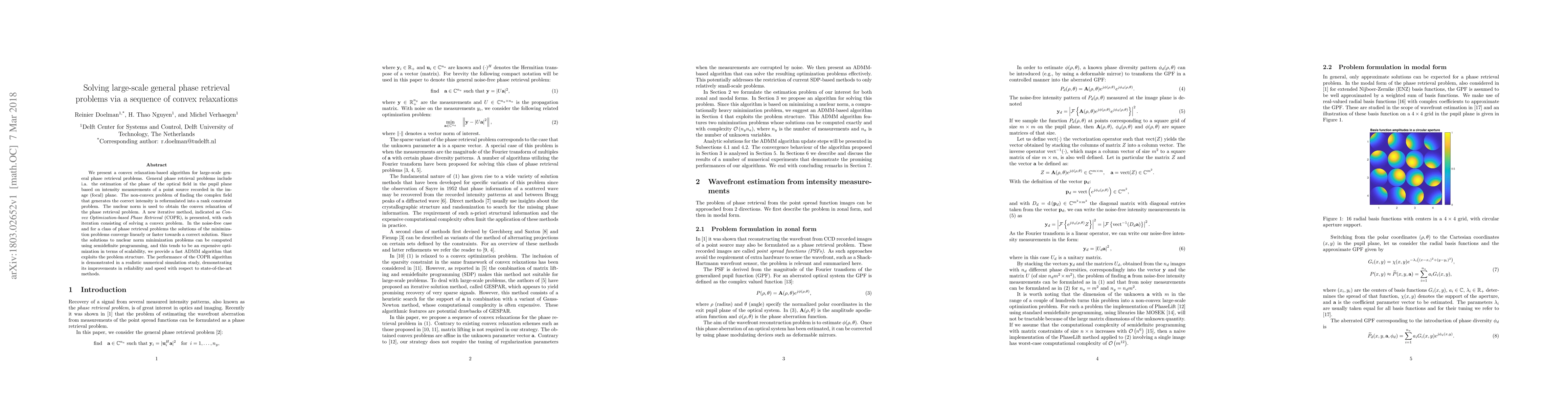 We present a convex relaxation-based algorithm for large-scale general phase retrieval problems. General phase retrieval problems include i.a. the estimation of the phase of the optical field in the pupil plane based on intensity measurements of a point source recorded in the image (focal) plane. The non-convex problem of finding the complex field that generates the correct intensity is reformulated into a rank constraint problem. The nuclear norm is used to obtain the convex relaxation of the phase retrieval problem. A new iterative method, indicated as Convex Optimization-based Phase Retrieval (COPR), is presented, with each iteration consisting of solving a convex problem. In the noise-free case and for a class of phase retrieval problems the solutions of the minimization problems converge linearly or faster towards a correct solution. Since the solutions to nuclear norm minimization problems can be computed using semidefinite programming, and this tends to be an expensive optimization in terms of scalability, we provide a fast ADMM algorithm that exploits the problem structure. The performance of the COPR algorithm is demonstrated in a realistic numerical simulation study, demonstrating its improvements in reliability and speed with respect to state-of-the-art methods.