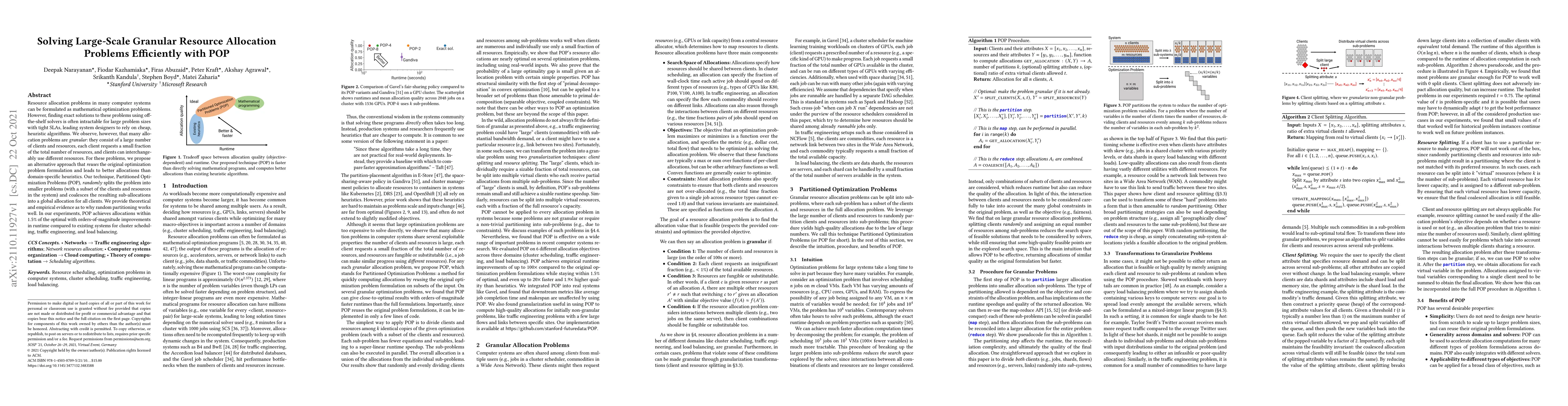 Researchers propose a new approach called Partitioned Optimization Problems (POP) to efficiently solve large-scale granular resource allocation problems, achieving allocations within 1.5% of the optimal with significant runtime improvements over existing systems.