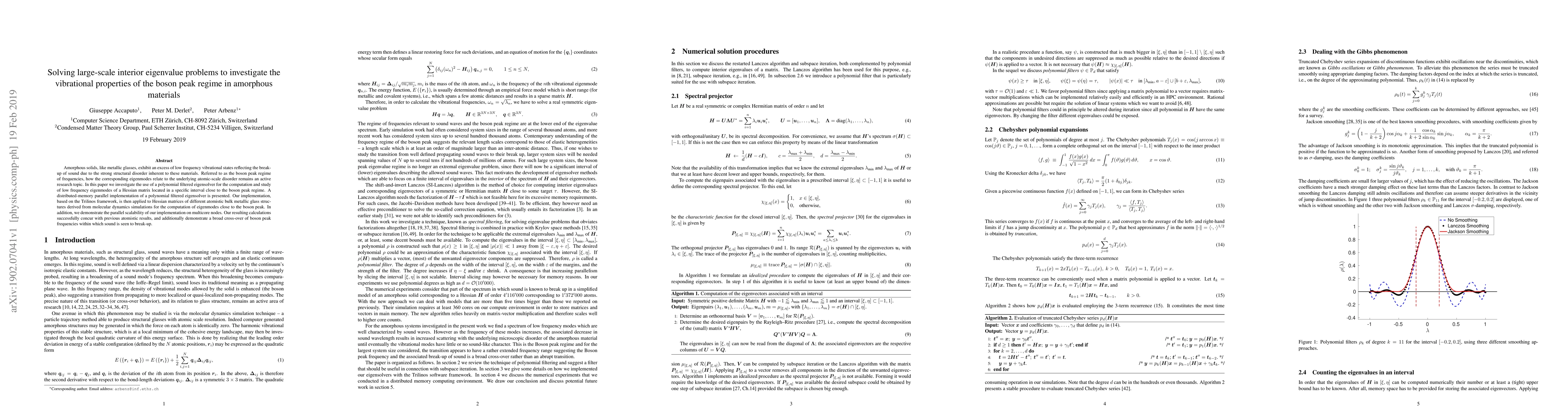 This paper explores the use of a polynomial filtered eigensolver for computing low-frequency eigenmodes near the boson peak in amorphous materials, employing a parallel implementation based on the Trilinos framework. The results confirm previous findings on the vibrational properties of metallic glasses and reveal a broad crossover of boson peak frequencies.