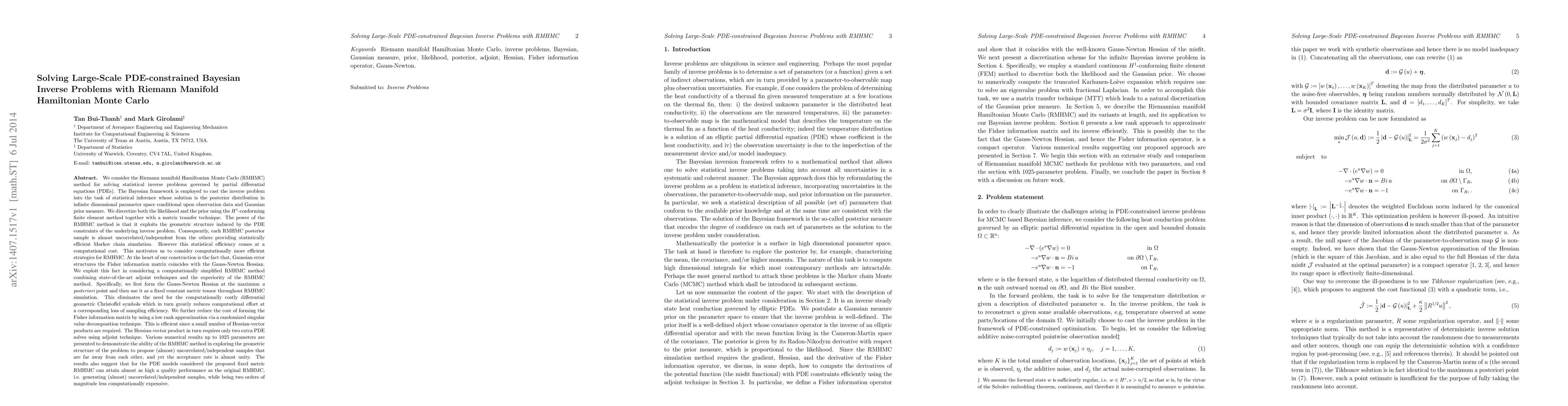 Summary: The paper proposes the Riemann manifold Hamiltonian Monte Carlo (RMHMC) method for efficiently solving large-scale PDE-constrained Bayesian inverse problems by leveraging the geometric structure imposed by the PDEs. It employs a low-rank approximation technique to reduce computational cost, requiring minimal PDE solves via the adjoint method, and demonstrates the method's efficiency in generating independent posterior samples.