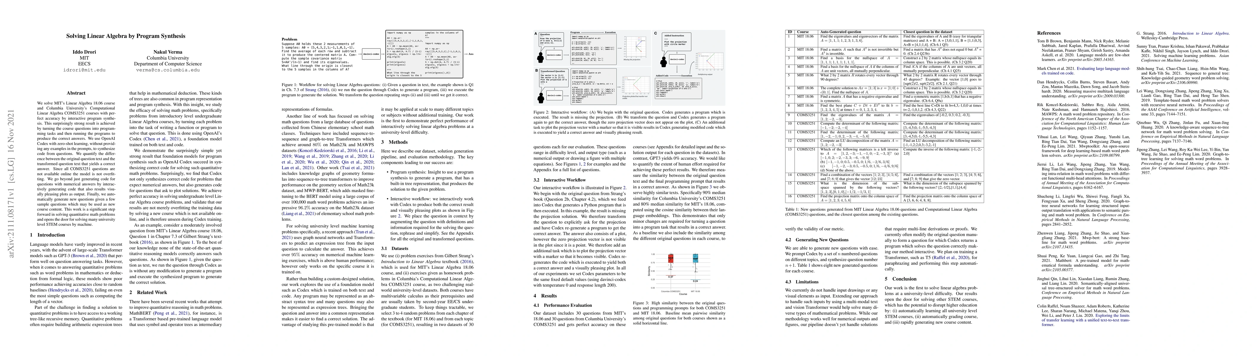 We solve MIT's Linear Algebra 18.06 course and Columbia University's Computational Linear Algebra COMS3251 courses with perfect accuracy by interactive program synthesis. This surprisingly strong result is achieved by turning the course questions into programming tasks and then running the programs to produce the correct answers. We use OpenAI Codex with zero-shot learning, without providing any examples in the prompts, to synthesize code from questions. We quantify the difference between the original question text and the transformed question text that yields a correct answer. Since all COMS3251 questions are not available online the model is not overfitting. We go beyond just generating code for questions with numerical answers by interactively generating code that also results visually pleasing plots as output. Finally, we automatically generate new questions given a few sample questions which may be used as new course content. This work is a significant step forward in solving quantitative math problems and opens the door for solving many university level STEM courses by machine.