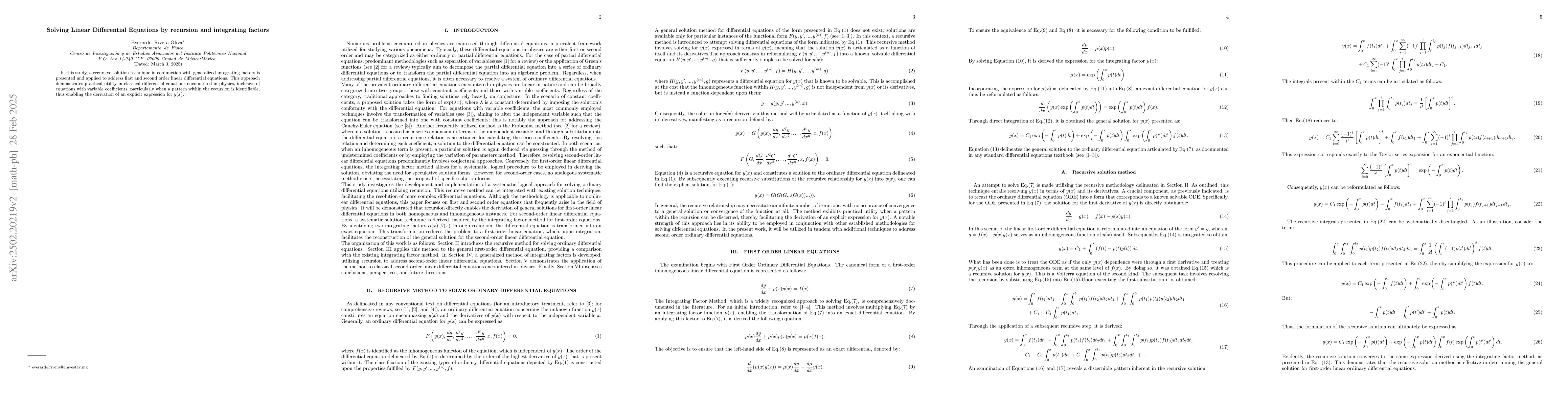 The research presents a recursive solution technique combined with generalized integrating factors to tackle first and second-order linear differential equations, particularly those with variable coefficients.