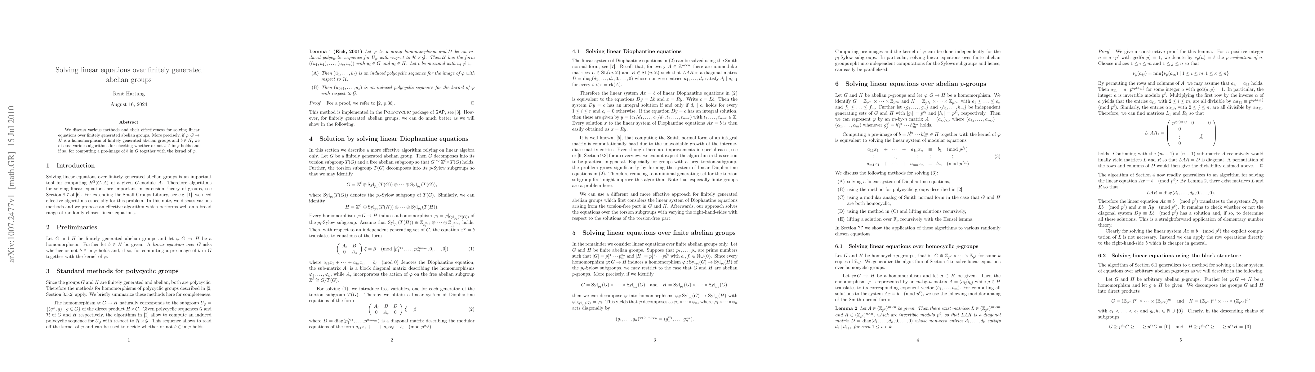 This paper explores algorithms for solving linear equations over finitely generated abelian groups, focusing on checking if an element belongs to the image of a homomorphism and computing a pre-image along with the kernel of the homomorphism.