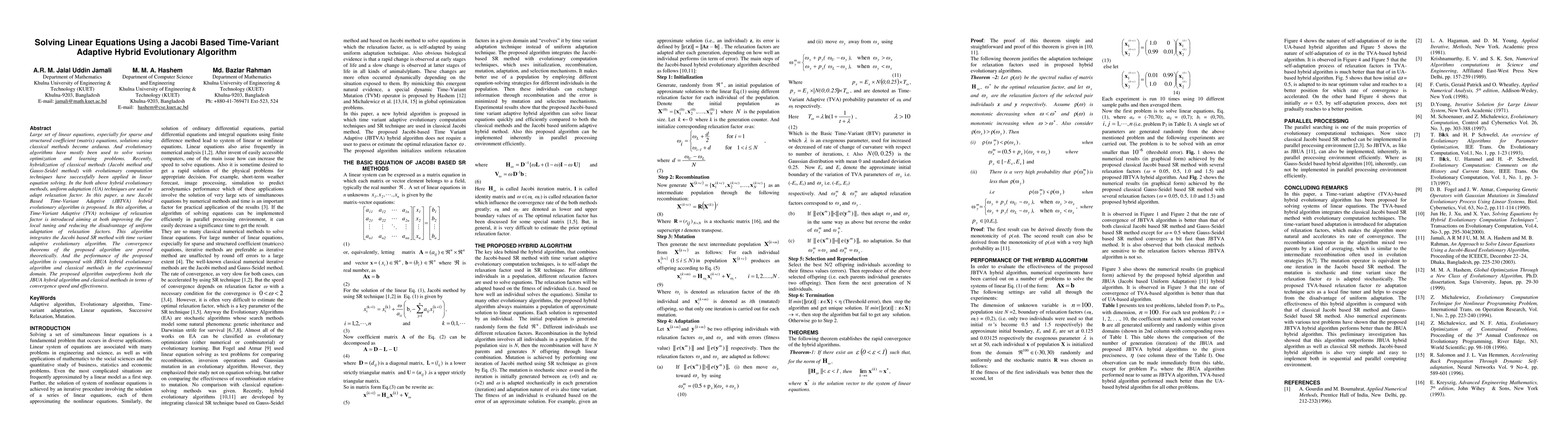 The paper presents a new Time-Variant Adaptive (TVA) technique for relaxation factor adaptation in a hybrid Jacobi-based evolutionary algorithm, enhancing convergence speed and effectiveness in solving linear equations.