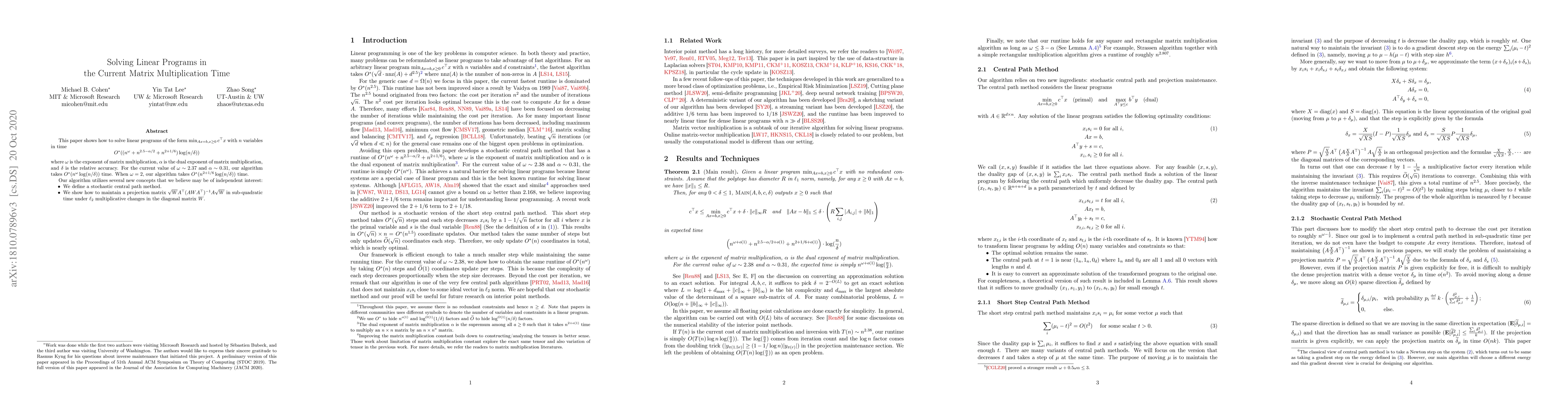 This paper shows how to solve linear programs of the form $\min_{Ax=b,x\geq0} c^\top x$ with $n$ variables in time $$O^*((n^{\omega}+n^{2.5-\alpha/2}+n^{2+1/6}) \log(n/\delta))$$ where $\omega$ is the exponent of matrix multiplication, $\alpha$ is the dual exponent of matrix multiplication, and $\delta$ is the relative accuracy. For the current value of $\omega\sim2.37$ and $\alpha\sim0.31$, our algorithm takes $O^*(n^{\omega} \log(n/\delta))$ time. When $\omega = 2$, our algorithm takes $O^*(n^{2+1/6} \log(n/\delta))$ time. Our algorithm utilizes several new concepts that we believe may be of independent interest: $\bullet$ We define a stochastic central path method. $\bullet$ We show how to maintain a projection matrix $\sqrt{W}A^{\top}(AWA^{\top})^{-1}A\sqrt{W}$ in sub-quadratic time under $\ell_{2}$ multiplicative changes in the diagonal matrix $W$.
