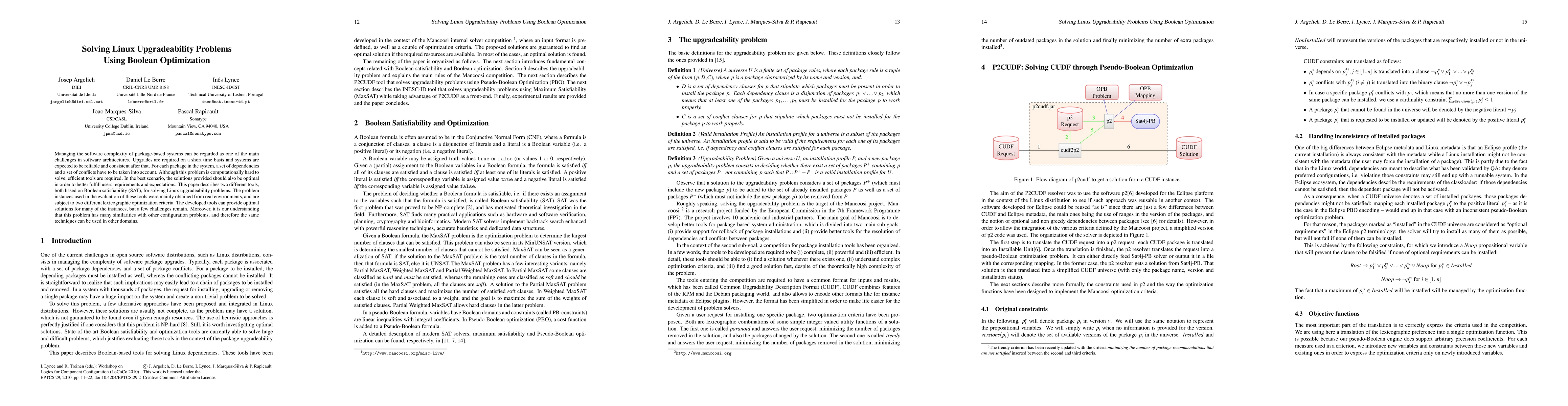 The paper presents two tools, P2CUDF and INESC-ID, both based on Boolean satisfiability (SAT) for solving Linux upgradeability problems. The tools translate the upgradeability problem into a Boolean optimization problem and use SAT solvers to find solutions. The evaluation instances are mainly from real environments, optimized under two lexicographic criteria.