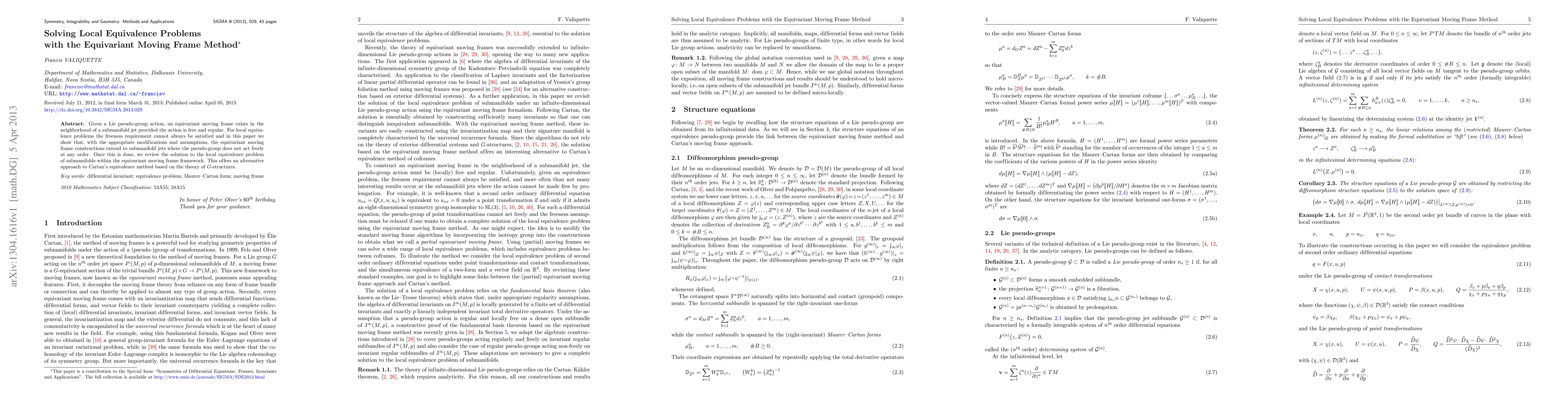 This paper extends equivariant moving frame constructions to solve local equivalence problems for submanifolds under non-free Lie pseudo-group actions, offering an alternative to Cartan's method based on G-structures. The approach modifies existing techniques to handle cases where the pseudo-group does not act freely.