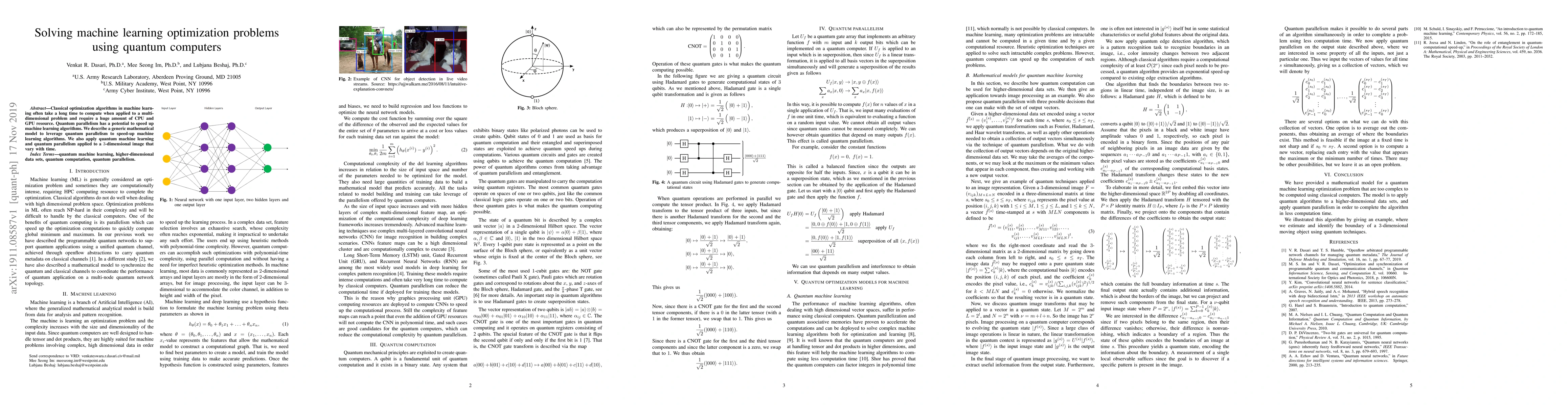 Classical optimization algorithms in machine learning often take a long time to compute when applied to a multi-dimensional problem and require a huge amount of CPU and GPU resource. Quantum parallelism has a potential to speed up machine learning algorithms. We describe a generic mathematical model to leverage quantum parallelism to speed-up machine learning algorithms. We also apply quantum machine learning and quantum parallelism applied to a $3$-dimensional image that vary with time.