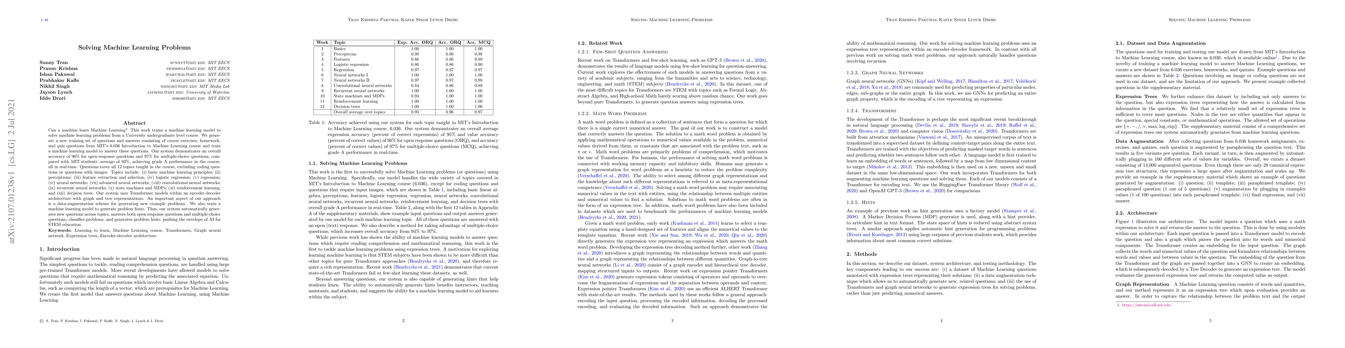 A machine learning model achieved an accuracy of 96% for open-response questions and 97% for multiple-choice questions in solving machine learning problems from a university undergraduate course, surpassing the average performance of MIT students.