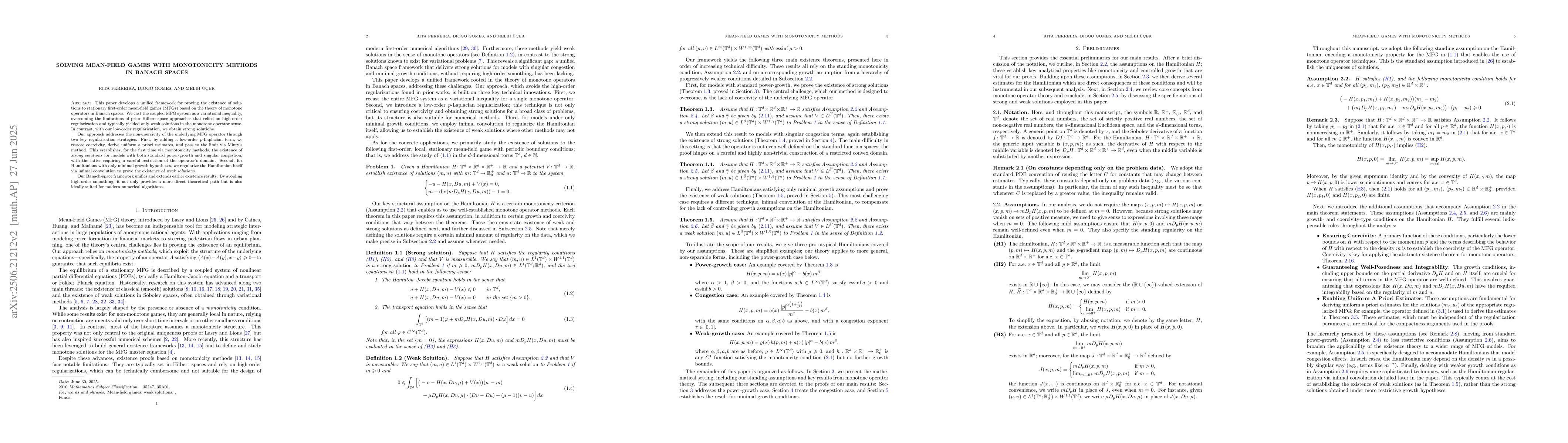 This paper develops a unified framework for proving the existence of solutions to stationary first-order mean-field games (MFGs) based on the theory of monotone operators in Banach spaces. We cast the coupled MFG system as a variational inequality, overcoming the limitations of prior Hilbert-space approaches that relied on high-order regularization and typically yielded only weak solutions in the monotone operator sense. In contrast, with our low-order regularization, we obtain strong solutions. Our approach addresses the non-coercivity of the underlying MFG operator through two key regularization strategies. First, by adding a low-order $p$-Laplacian term, we restore coercivity, derive uniform a priori estimates, and pass to the limit via Minty's method. This establishes, for the first time via monotonicity methods, the existence of strong solutions for models with both standard power-growth and singular congestion, with the latter requiring a careful restriction of the operator's domain. Second, for Hamiltonians with only minimal growth hypotheses, we regularize the Hamiltonian itself via infimal convolution to prove the existence of weak solutions. Our Banach-space framework unifies and extends earlier existence results. By avoiding high-order smoothing, it not only provides a more direct theoretical path but is also ideally suited for modern numerical algorithms.