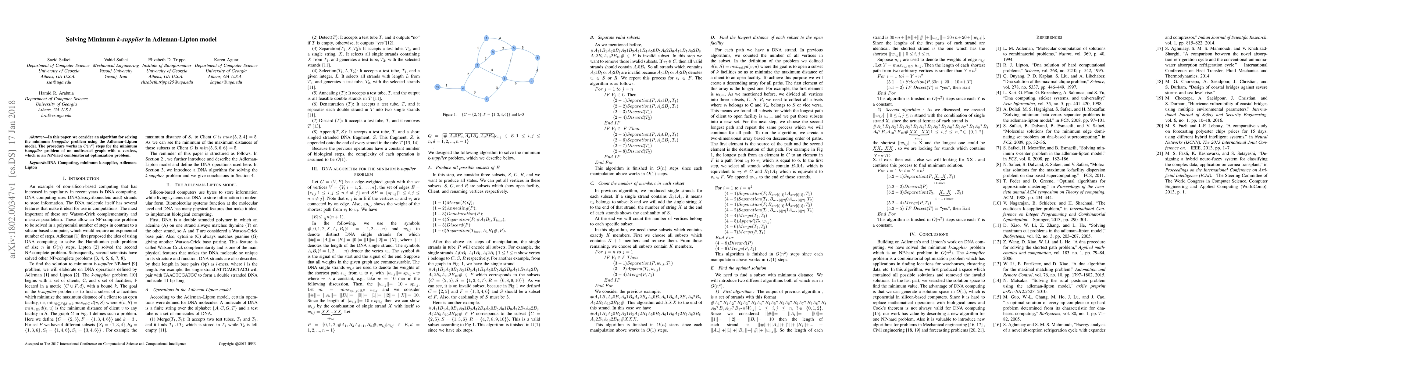 This paper proposes an algorithm to solve the minimum k-supplier problem using the Adleman-Lipton model, achieving polynomial-time complexity for an NP-hard combinatorial optimization problem on an undirected graph with n vertices.