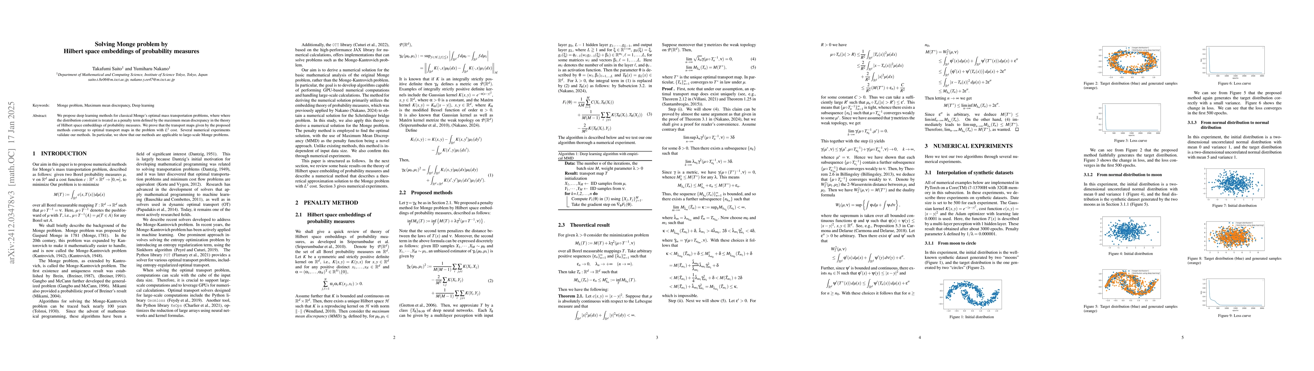 The paper proposes deep learning methods for solving Monge's optimal mass transportation problem using Hilbert space embeddings to treat distribution constraints, demonstrating convergence to optimal transport maps and validating effectiveness through numerical experiments, especially for large-scale problems.